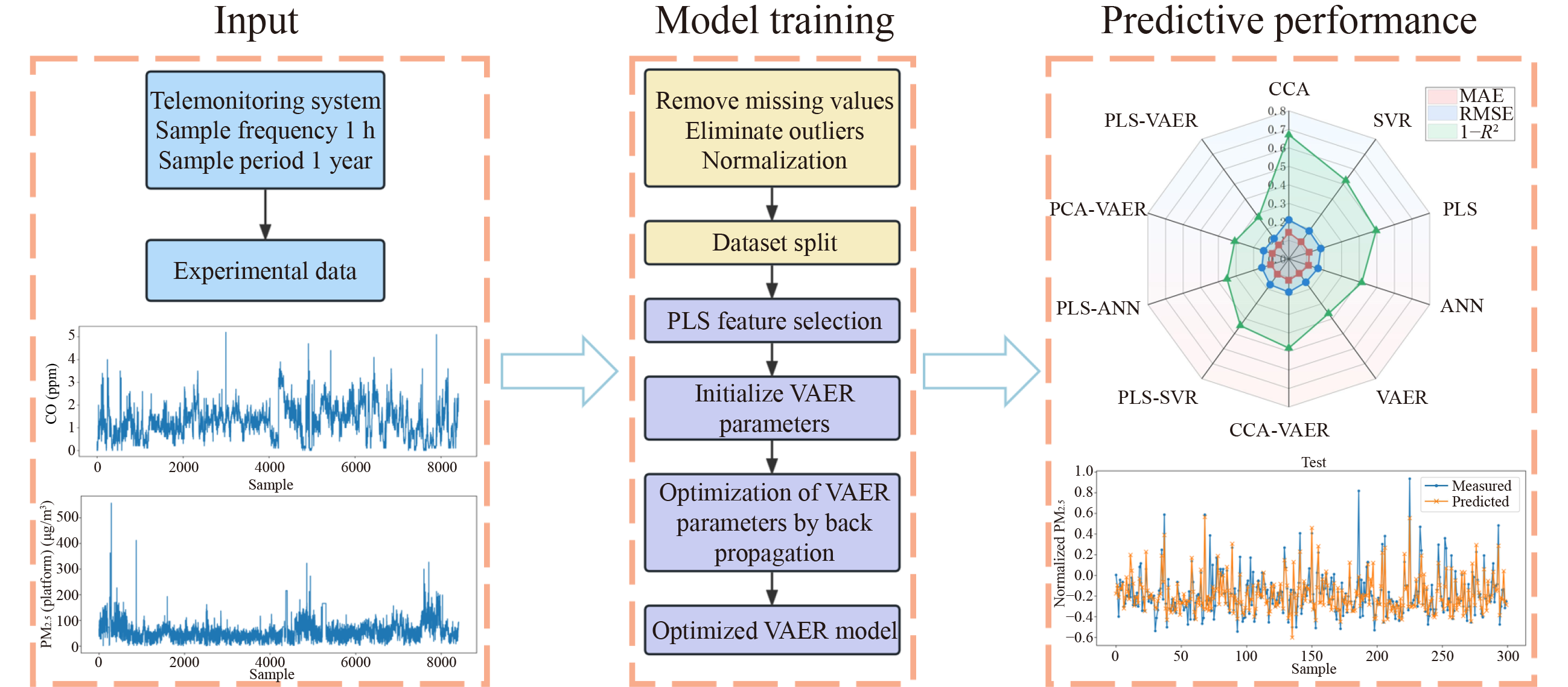 ● PLS-VAER is proposed for modeling of PM2.5 concentration. ● Data are decomposed by PLS to capture nonlinear feature. ● VAER can improve the predictive performance by variational inference. ● The proposed model provides a novel method for monitoring indoor air quality.