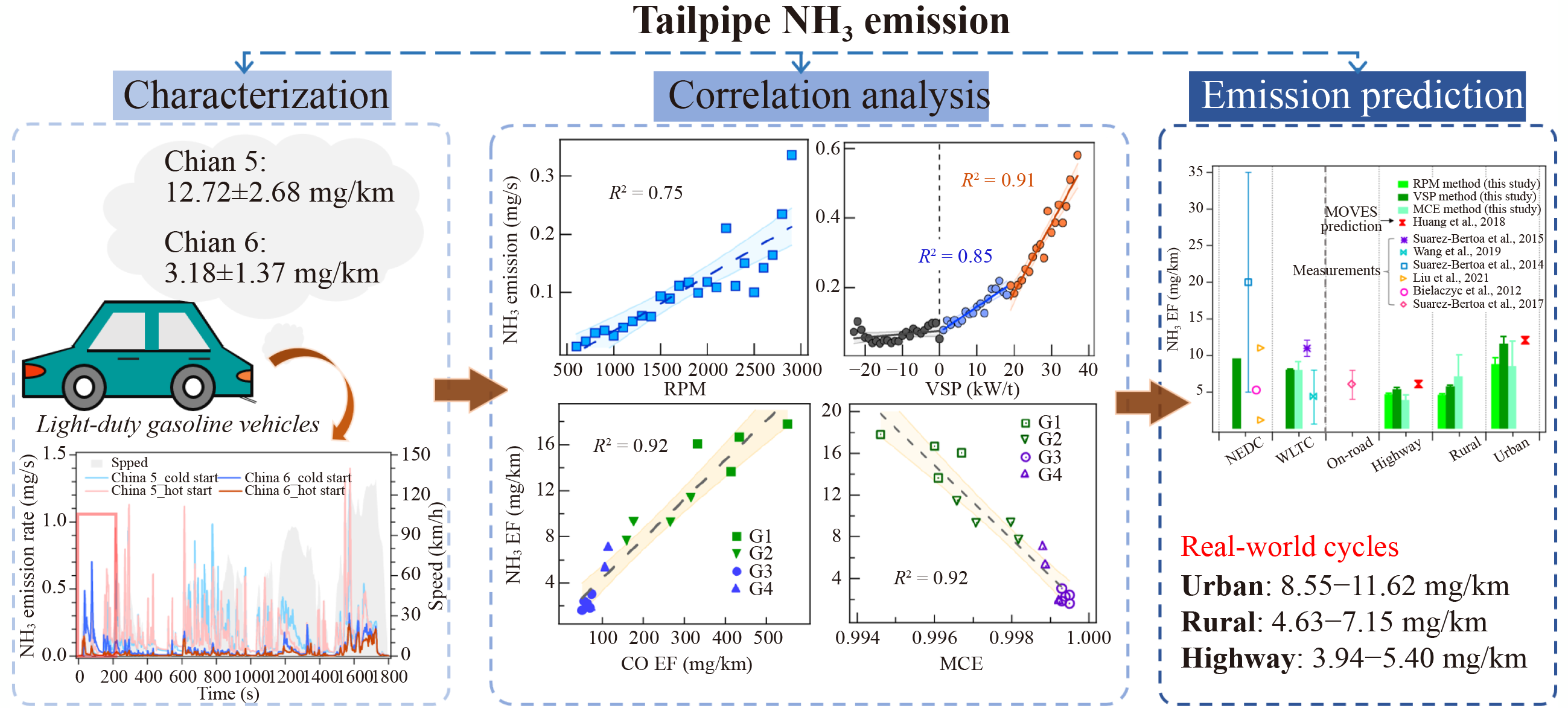 On-road tailpipe ammonia (NH3) emissions contribute to urban secondary organic aerosol formation and have direct or indirect adverse impacts on the environment and human health. To understand the tailpipe NH3 emission characteristics, we performed comprehensive chassis dynamometer measurements of NH3 emission from two China 5 and two China 6 light-duty gasoline vehicles (LDGVs) equipped with three-way catalytic converters (TWCs). The results showed that the distance-based emission factors (EFs) were 12.72 ± 2.68 and 3.18 ± 1.37 mg/km for China 5 and China 6 LDGVs, respectively. Upgrades in emission standards were associated with a reduction in tailpipe NH3 emission. In addition, high NH3 EFs were observed during the engine warm-up period in cold-start cases owing to the intensive emissions of incomplete combustion products and suitable catalytic temperature in the TWCs. Notably, based on the instantaneous NH3 emission rate, distinct NH3–emitting events were detected under high/extra high velocity or rapid acceleration. Furthermore, NH3 emission rates correlated well with engine speed, vehicle specific power, and modified combustion efficiency, which were more easily accessible. These strong correlations were applied to reproduce NH3 emissions from China 5/6 LDGVs. The predicted NH3 EFs under different dynamometer and real-world cycles agreed well with existing measurement and prediction results, revealing that the NH3 EFs of LDGVs in urban routes were within 8.55–11.62 mg/km. The results presented here substantially contribute to improving the NH3 emission inventory for LDGVs and predicting on-road NH3 emissions in China.