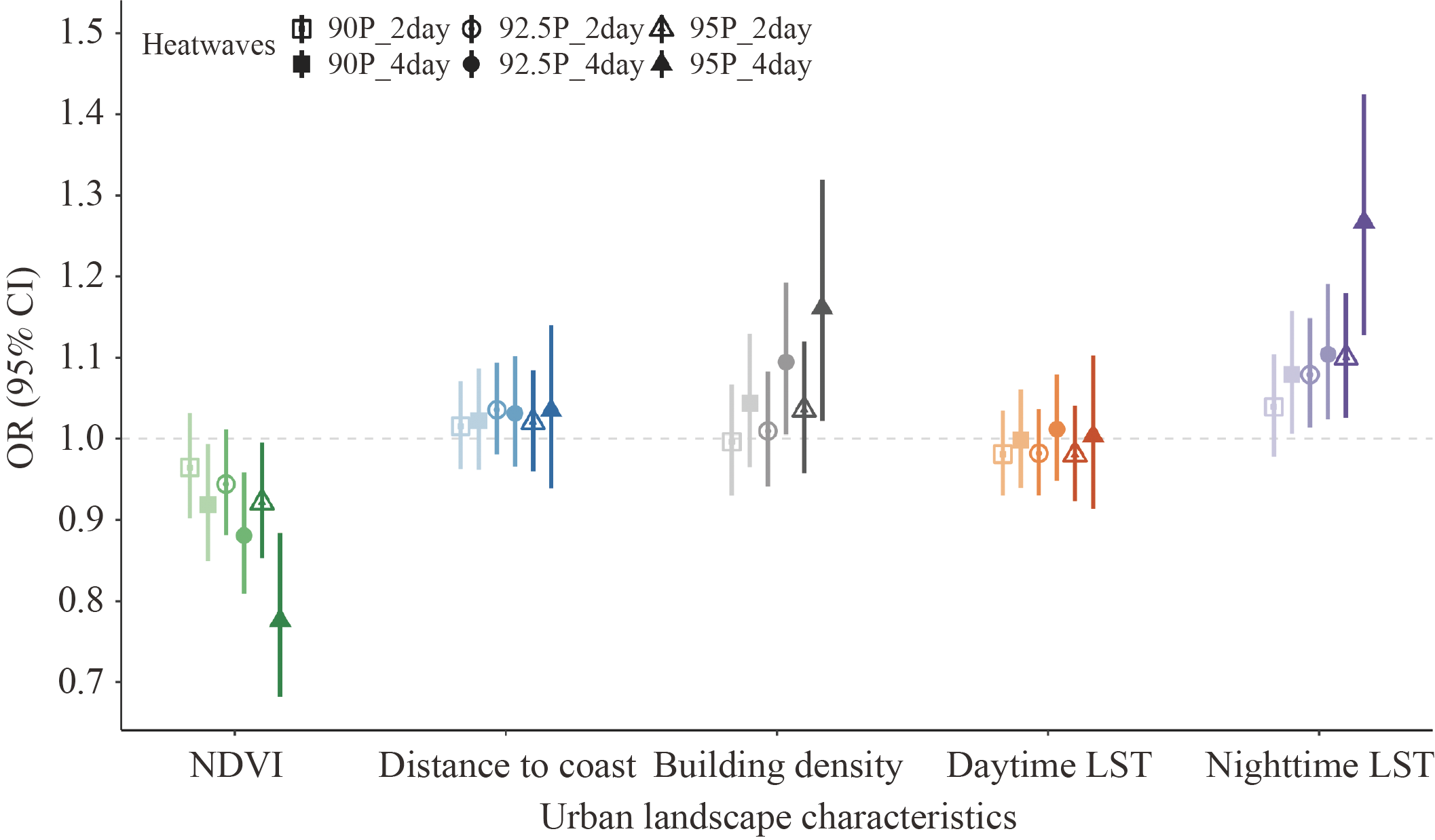 ● The effect modifications of urban landscape were explored at the intra-urban level. ● Higher levels of green spaces could alleviate adverse health impacts of heatwaves. ● Higher building density and nighttime land surface temperatures aggravate impacts. ● Effects of urban landscape were more significant in older adults and males. ● Pronounced effect modifications were observed under hotter and longer heatwaves.