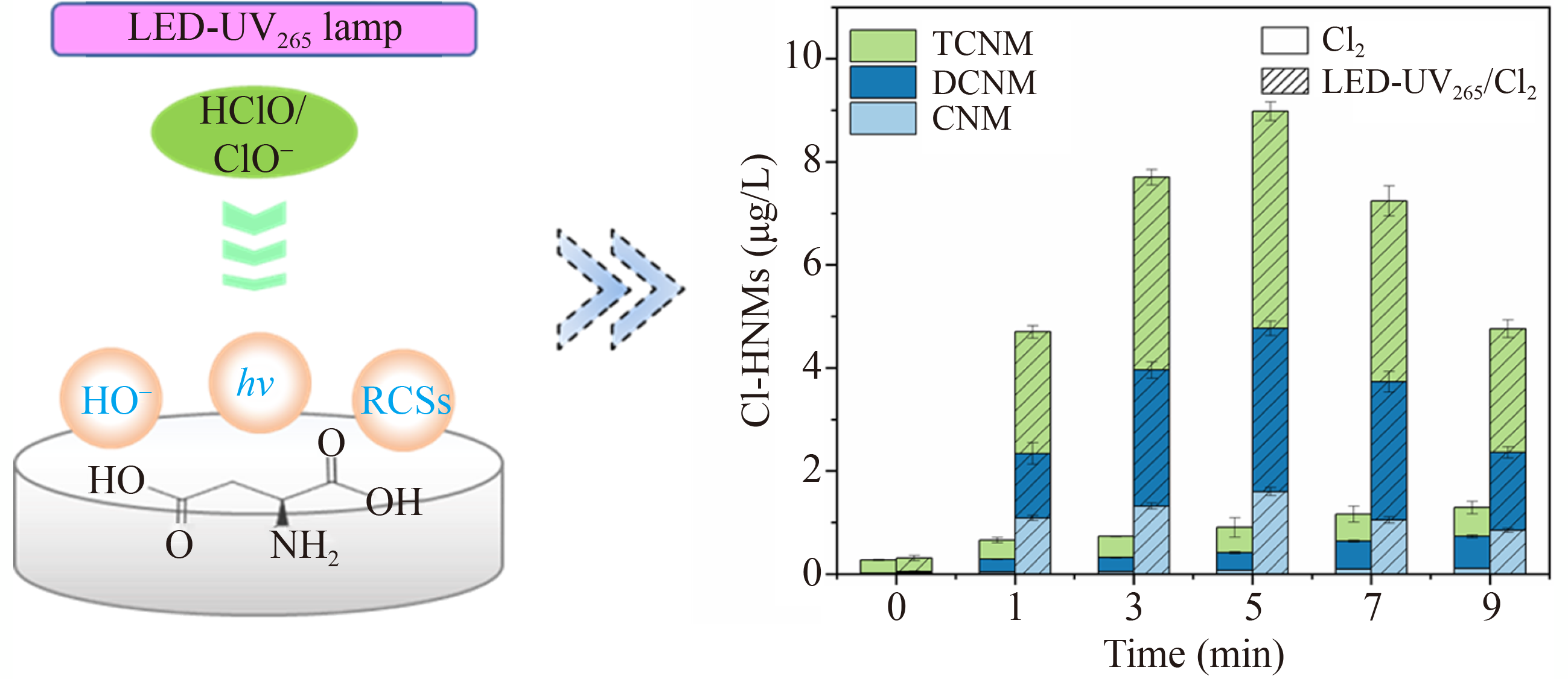 Light emitting diode (LED-UV)/chlorine disinfection can replace UV/chlorine disinfection in wastewater treatment plants and water supply plants. Halonitromethanes (HNMs) are a class of novel nitrogenous disinfection by-products, which are characterized by higher cytotoxicity and genotoxicity than regulated disinfection by-products. Herein, the impact factors and pathways of HNMs formation from aspartic acid (ASP) were investigated during LED-UV265/chlorine disinfection. The results showed that three types of chlorinated-HNMs (Cl-HNMs) were found during LED-UV265/chlorine disinfection, and their concentrations increased first and then declined as the reaction progressed. Cl-HNMs yields increased with increasing LED-UV265 intensity, free chlorine dosage, and ASP concentration, which declined with increasing pH (6.0–8.0). Meantime, the important impact of the coexisting ions contained in water matrices on HNMs formation from ASP was observed during LED-UV265/chlorine disinfection. It was found that copper ions (Cu2+) promoted Cl-HNMs formation. Furthermore, when bromide (Br–) appeared during LED-UV265/chlorine disinfection, nine types of HNMs were detected simultaneously. Moreover, Br– not only converted Cl-HNMs toward brominated (chlorinated)-HNMs and brominated-HNMs but also showed a marked effect on HNMs concentrations and species. Subsequently, the possible pathways of HNMs formation from ASP were proposed during LED-UV265/chlorine disinfection. At last, it was proved that the formation trends of HNMs obtained in the real waters were similar to those in simulated waters. This work elaborated on the influence factors and pathways of HNMs formation, which is conducive to controlling the HNMs produced during LED-UV265/chlorine disinfection.