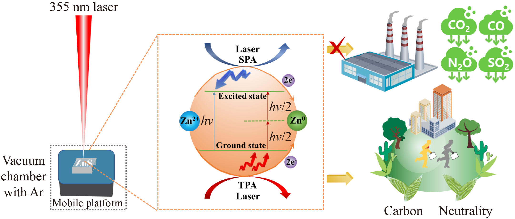 In response to the goal of net-zero emissions proposed by Intergovernmental Panel on Climate Change, Chinese government has pledged that carbon emissions will peak by 2030, and achieve carbon neutrality by 2060. However, the high carbon energy structure of traditional industries has aggravated environmental problems, such as greenhouse effect and air pollution. The goal of carbon neutrality will be difficult to achieve without the development of disruptive theories and technologies. The electrolytic zinc industry requires high-temperature roasting at ~1000 °C, generating large amounts of greenhouse gases and SO2. High concentrations of sulfuric acid (200 g/L) are subsequently used for electrolysis, and each ton of zinc produced generates 50 kg of anode slime with lead content of up to 16%, as well as 0.35 m3 of wastewater containing zinc and lead. To solve these problems, an optical metallurgy method is proposed in this study. The proposed method uses laser-induced photoreduction to decompose ZnS and reduce metal ions to metal. Results indicate that Zn0 and S8 can be detected on the surface of ZnS at a specific wavelength and laser fluence. The generation mechanism of Zn0 is such that laser induces an electronic transition that breaks ionic bond in ZnS, resulting in its decomposition and photoreduction to Zn0 under an inert argon gas atmosphere. This method does not reduce other metals in the mineral since it does not use high-temperature roasting, providing a new way of producing high-purity metal without greenhouse gas emissions and heavy metal pollution caused by traditional zinc electrolysis.