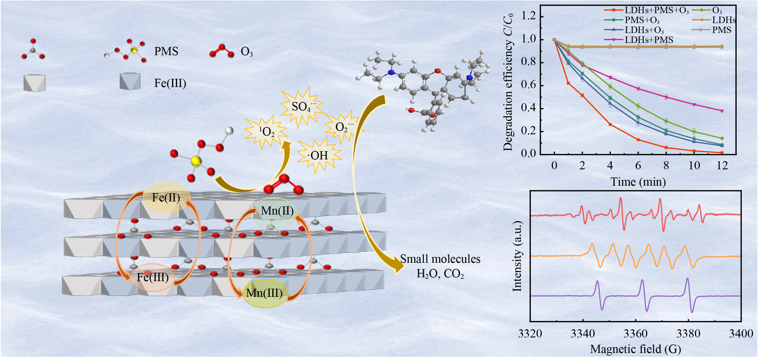 ● A three-phase catalytic system was constructed to degrade typical dyes RhB. ● RhB could be effectively removed at the pH range of 3–9 within 10 min. ● The synergistic mechanism of MnFe-LDH catalysis on PMS/O3 was investigated. ● The degradation pathways and ecotoxicity of the intermediates of RhB were proposed.