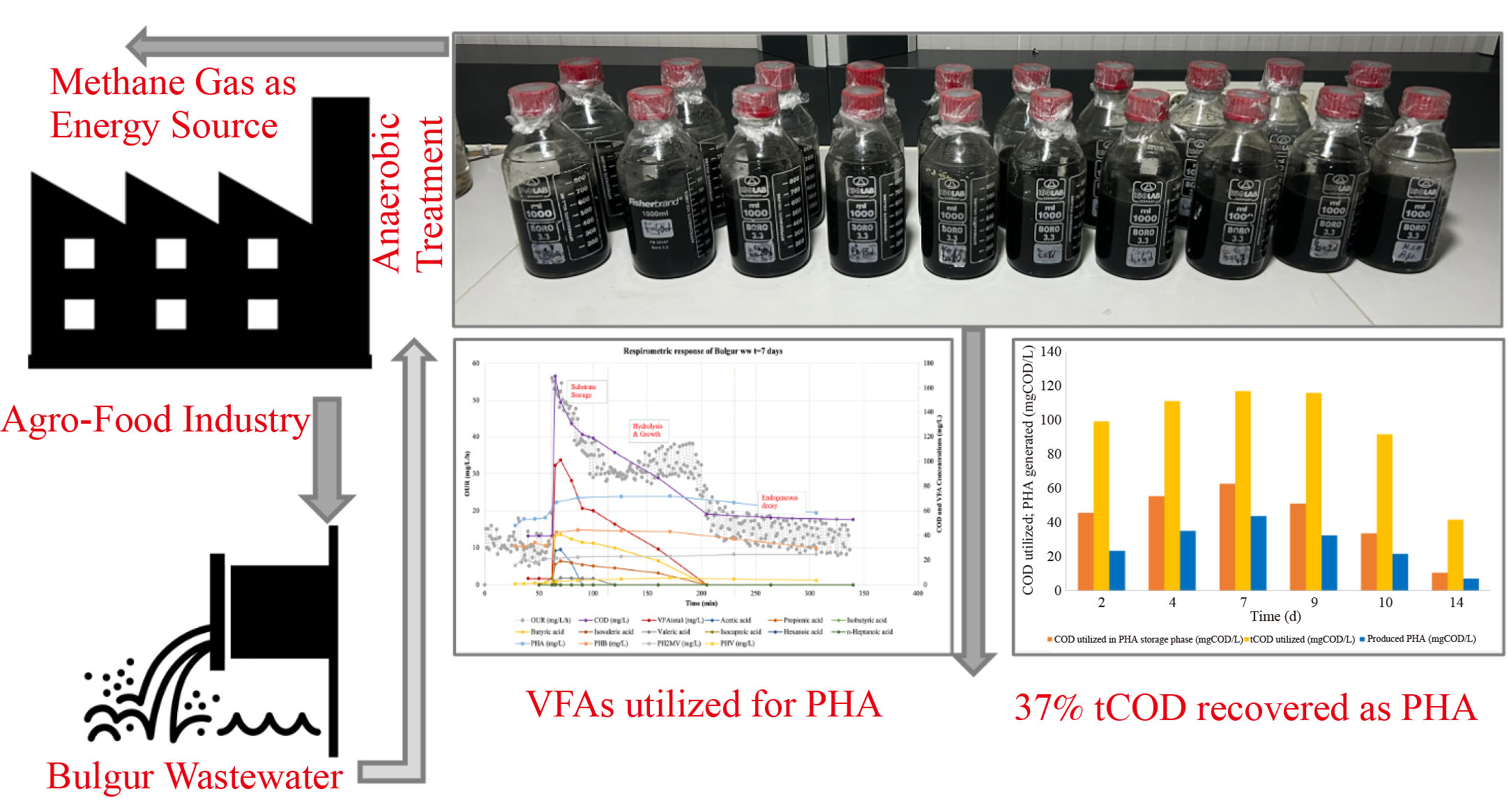 The aim of this study is to investigate the anaerobic treatability and generation of potential valuable by-products of agro-food industry wastewaters where bulgur production is carried out. Among the agro-food products, bulgur which is a wheat product (Triticum spp.) and rich in fibers, is one of the ancient foods of Anatolia. The most critical issue in bulgur production is high energy and water consumption for cooking where wheat starch gelatinizes and results in a considerable amount of high strength wastewater. In the raw bulgur wastewater sample, 81% of total chemical oxygen demand (tCOD) was in soluble form which was readily fermentable and acidic by nature. Batch anaerobic study results indicated almost complete tCOD removal (99%) which decreased from 7820 to100 mg/L. The cumulative methane yield was determined as 275 mL/g tCODfed. Hence, for such industrial wastewaters with high level of organic pollution, anaerobic biotechnology stands out as one of the most effective treatment options. Fermented bulgur wastewater was also tested for the production of polyhydroxyalkanoates (PHAs). It was determined that 37% of the tCOD could be recovered as PHAs without hindering the biogas generation. In this context, it was shown that PHAs and biogas production could be simultaneously achievable with a smart organic carbon utilization strategy which will also contribute to reduce energy requirement and carbon footprint of the industrial bulgur production process as well as create environmentally friendly solutions through resource recovery.
