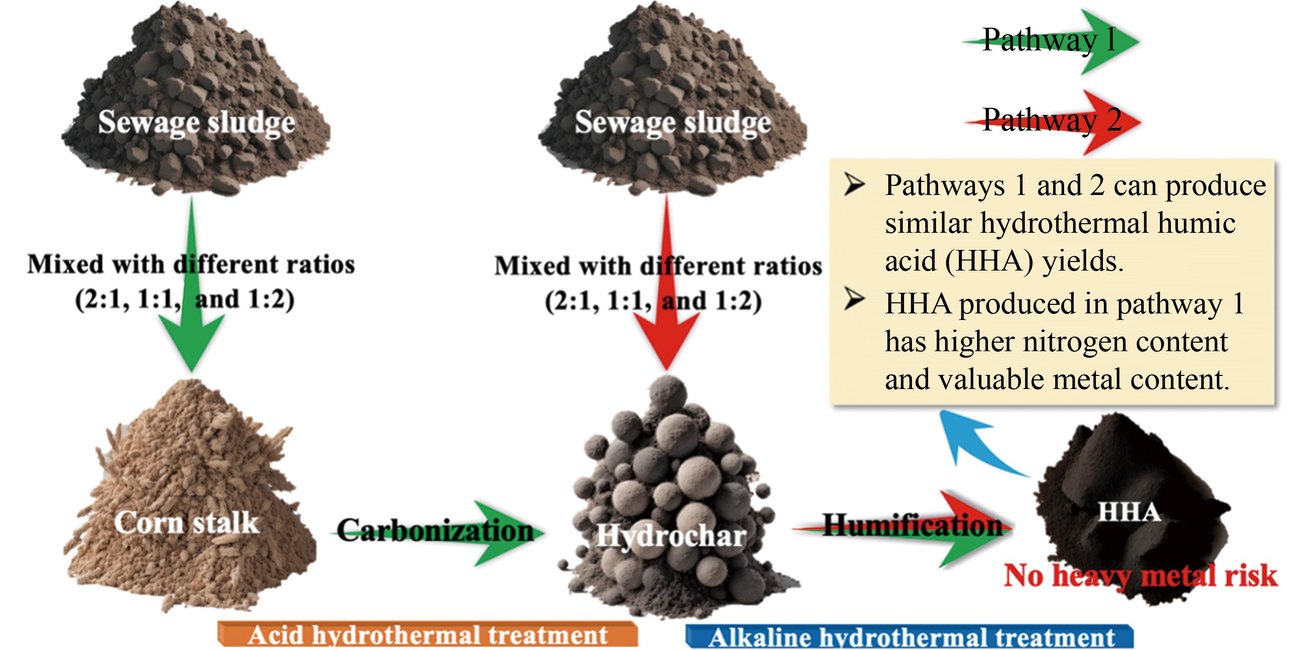 The high organic carbon content in corn stalks (CS) and the rich nitrogen resources in sewage sludge (SS) render them ideal for the hydrothermal production of nitrogen-enriched hydrothermal humic acid (HHA). This study conducted co-hydrothermal humification experiments using varying ratios of CS to SS under two distinct mixing modes: 1) co-hydrothermal carbonization of CS and SS, followed by alkaline hydrothermal humification to yield HHA, and 2) mixing CS-derived hydrochar with SS, followed by alkaline hydrothermal humification to yield HHA. The results indicated no significant difference in HHA yield between the modes when using equivalent raw material ratios. Importantly, the HHA produced did not pose a heavy metal risk. However, HHA from mode (1) had nearly double the nitrogen content compared to mode (2) and contained more valuable metal elements. The study confirmed that while co-hydrothermal humification of CS and SS did not significantly enhance HHA yield, it did markedly increase nitrogen content. Furthermore, HHA yield decreased with increasing SS content in the raw materials, likely due to SS's high ash content (52.4 wt%). In contrast, the nitrogen content in HHA increased with higher SS content, rising from 2.0 wt% to 3.8 wt% in mode (1) and from 1.1 wt% to 2.3 wt% in mode (2). Upon comprehensive analysis of both modes, the study suggests that mode (1) is more promising for engineering applications, as it facilitates the efficient disposal of a larger amount of SS.