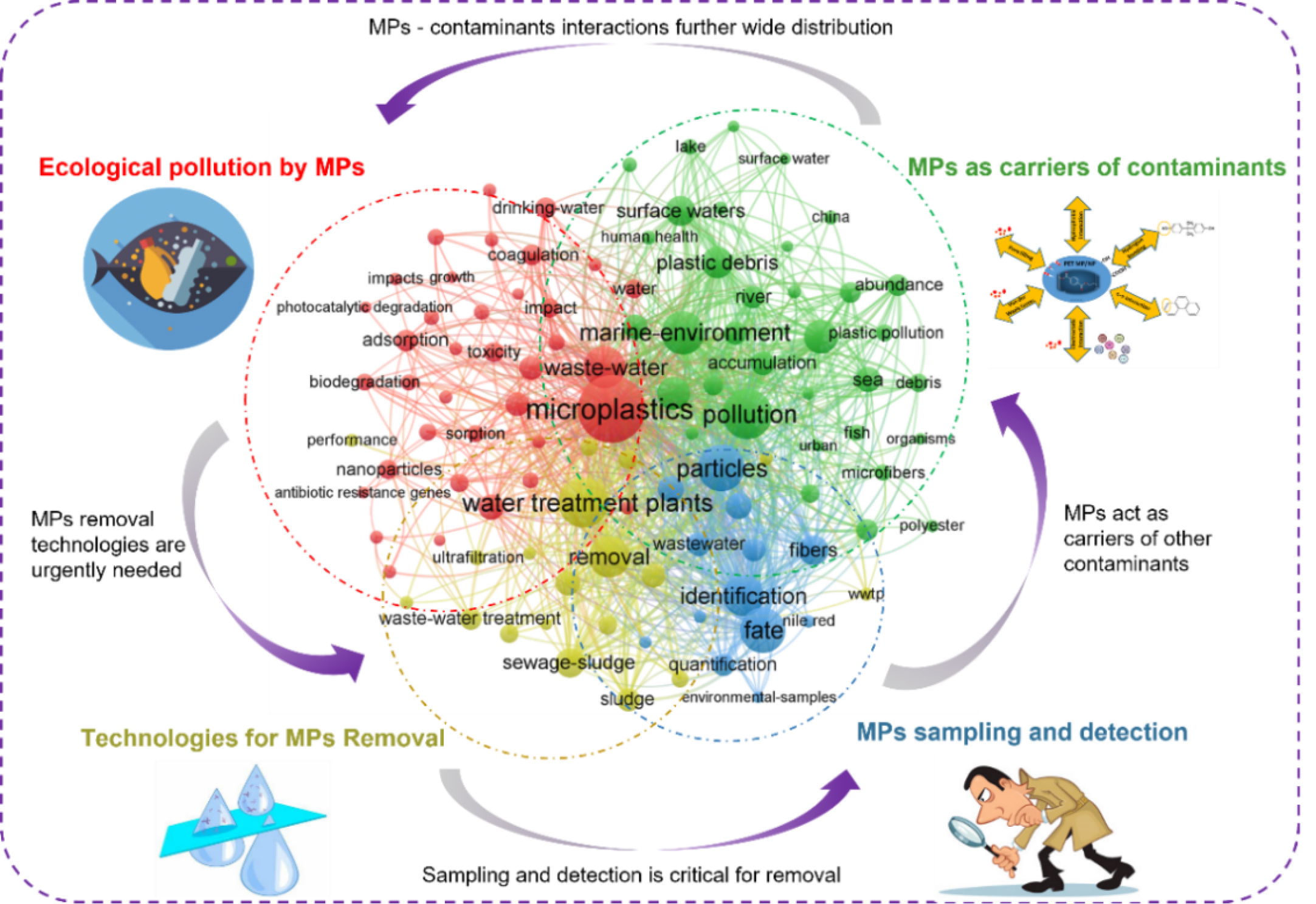 In recent years, concerns regarding the adverse effects of microplastics (MPs) on both the environment and human life have been increasingly raised. The presence of MPs in the aquatic environment and relevant treatment attracts growing attention worldwide. To address the rising concerns about public health and the regulatory pressure, numerous endeavors have been directed toward the development of effective analysis and treatment technologies for the removal of MPs from water. This review aimed to reveal recent research trends, perspectives and implications of MPs presented in the field of water treatment. First, a bibliometric analysis, including spatial and temporal trends assessment, publication and keywords analysis, was conducted to offer insights into its development history and research trends. Next, keyword analysis on recent literature was conducted to examine the temporal and categorical patterns of high-frequency research trends. Then, based on keywords analysis, the research progress and hotspots of MPs research within the domain of water treatment were discussed as four categories: sampling and detection methods for aquatic MPs, MPs as carriers of contaminants upon exposure to water environment, the ecological pollution by MPs, and technology development for MPs removal. Finally, challenges of MPs in water treatment and future implications to existing research field were also presented.