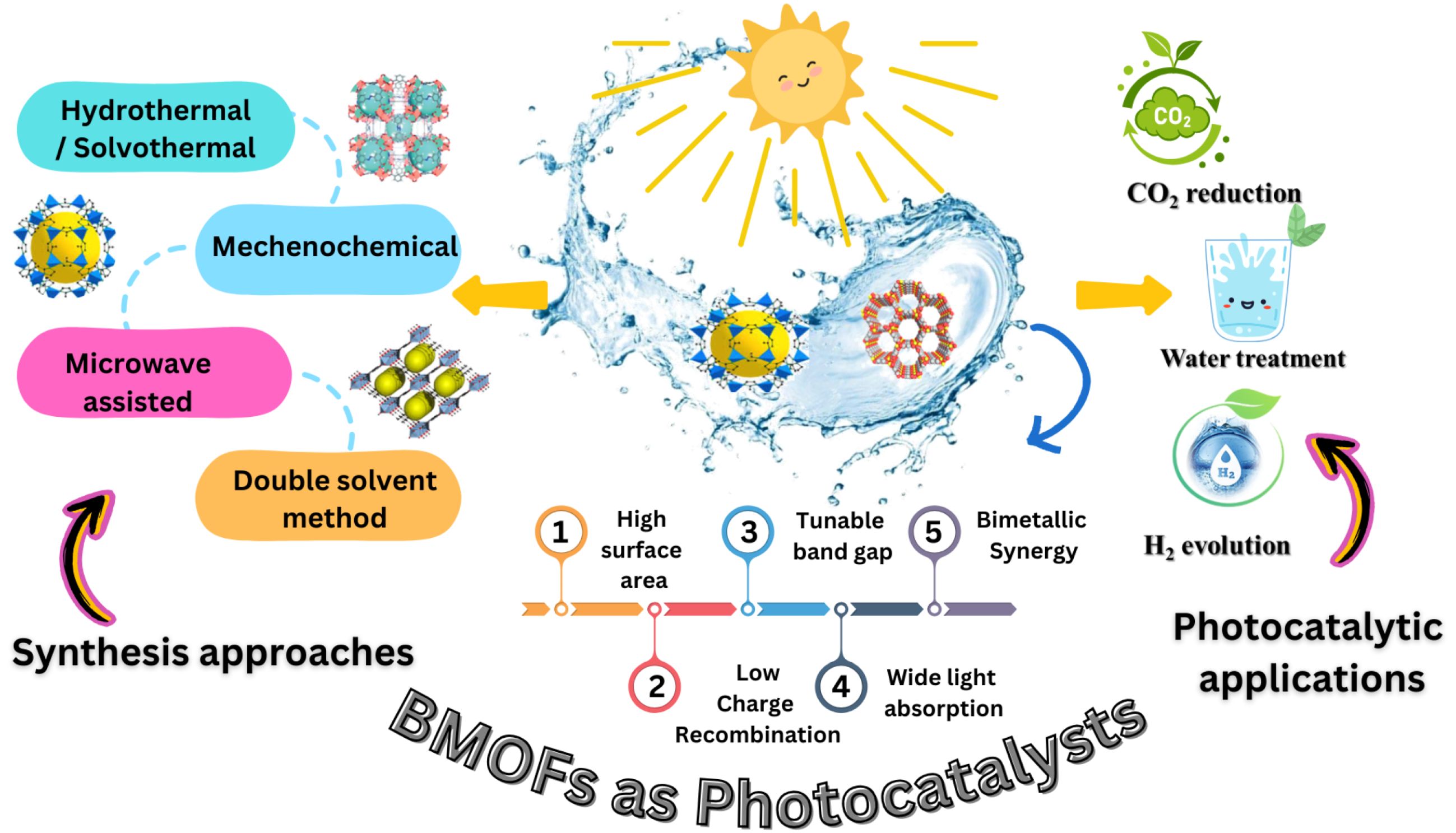 Photocatalysis contributes significantly to global economic development and has promising environment application like degradation of organic contamination and energy production. The initiatives are concentrated on accelerating the reaction rates and designing novel photocatalysts for improving the ability and enhance the selectivity toward specific products. Recently, bimetallic nanoparticles (NP)/metal-organic frameworks (BMOFs), gained broader interests in heterogeneous catalysis due to their unique photocatalytic properties. Coupling of bimetallic nanoparticles with metal-organic frameworks has found to be a highly effective strategy to improve the photocatalytic activity and broaden the reaction scope. In addition, BMOFs have been found to have exceptional capabilities in breaking down organic pollutants, reducing heavy metals and producing energy. These remarkable abilities are believed to be a result of the combined effects of the bimetallic centers. This review summarizes and analyses the recent advancements in BMOFs based materials especially heterojunctions for degradation of organic pollutants and also in energy production. Different synthesis techniques of designing BMOFs composites are highlighted in this study. The underlying mechanism synergistically enhanced performance in heterogeneous catalysis is thoroughly examined. This review also explores the challenges and possible future pathways in photocatalysis using BMOFs. There are several important challenges that need to be addressed in order to improve the durability of BMOFs in real-world conditions, optimize the synthesis process for industrial applications and gain a deeper understanding of the complicated structures that influence their photocatalytic processes.