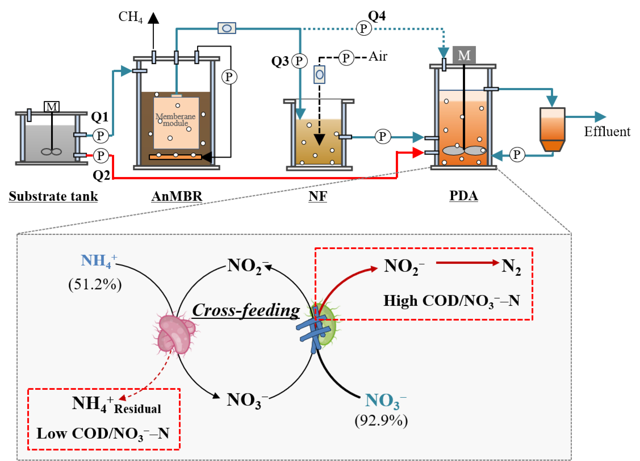 In this study, an anaerobic membrane bioreactor coupled with a complete nitrification and partial denitrification–anammox process (AnMBR–NF–PDA) was developed to efficiently remove both chemical oxygen demand (COD) and nitrogen. Precise control of raw water ratios was utilized to adjust the ratio of COD/NO3−–N, resulting in maximum nitrogen removal efficiency of 90.14% at a ratio of 3.44. Initially, specific anammox activity (SAA) increased with the proportion of raw water, peaking at 17.83 mg-N/(g-VSS∙d) in stage II before decreasing. This variation was attributed to the significant presence of filamentous bacteria, especially “Acinetobacter” (13.58%–31.59%), which facilitated nitrite generation, supporting the nitrous oxide hypothesis in partial denitrification processes and enabling cross-feeding with AnAOB. Additionally, the average particle size of granular sludge increased from 300 to 528 µm under the influence of filamentous bacteria. Metagenomic analysis revealed an upsurge in genes associated with partial denitrification (NarG and NapA) as the COD/NO3–N ratio rose. The abundance of genes closely correlated with anammox (Hzs and Hdh) peaked during stage II, indicating the beneficial role of filamentous bacteria in the stable conversion of nitrite in PDA system. This study offers valuable insights into optimizing the synergistic metabolism and granulation processes involving filamentous bacteria and AnAOB, thereby laying the groundwork for the practical application of AnMBR coupled with anammox processes in wastewater treatment.