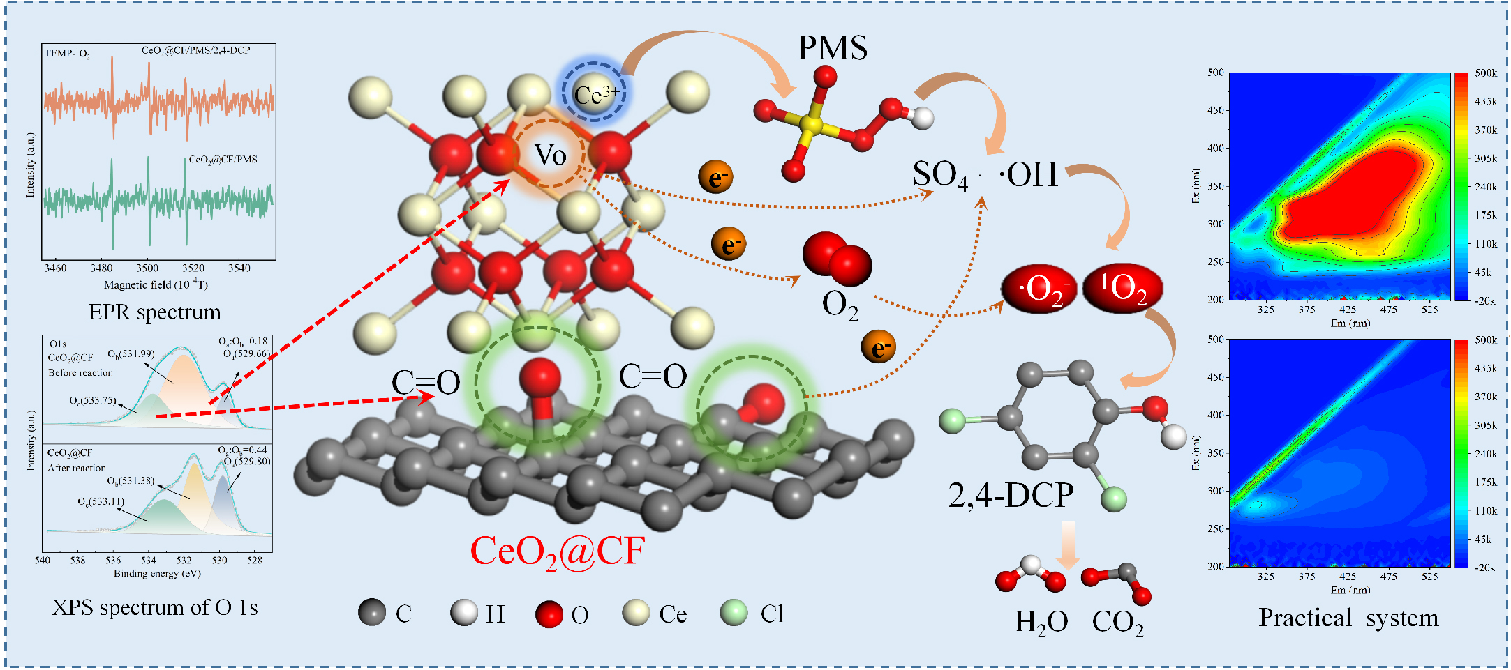 ● CeO2 was uniformly coated on the surface of carbon fibers with fibrous structure. ● 1O2 are generated on the active sites of Vo and C=O for CeO2@CF. ● A large number of electron-rich oxygen vacancies formation inside CeO2@CF. ● Complete degradation of 50 mg/L 2,4-DCP was realized with good mineralization. ● It shows good purification ability for actual coking wastewater.