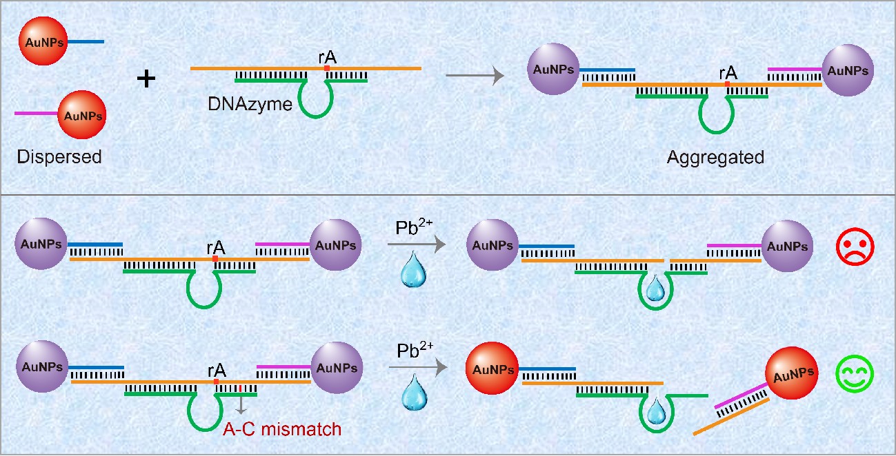 Facile and ultrasensitive detection of Pb2+ in water for remote or resource-limited environments remains challenging. DNAzyme-based colorimetric nanobiosensors have been extensively studied to regulate the assembly of functionalized gold nanoparticles (AuNPs). However, these nanobiosensors have been criticized for their low sensitivity owing to the difficulty of dissociating DNAzyme embedded in AuNP aggregates. To address this issue, we rationally designed a DNAzyme by introducing an adenine-cytosine (A-C) mismatch to strengthen the disassembly of DNAzyme-linked nanostructures. As proof of concept, a “turn on” colorimetric nanobiosensor integrated with mismatched DNAzyme and functionalized AuNPs was first developed for Pb2+ detection. Under the optimal detection conditions, the obtained typical calibration curve shows a detection limit of 8.6 nmol/L, with an approximately 11-fold sensitivity improvement in Pb2+ detection compared with unmismatched DNAzyme, and a linear response range from 10 to 300 nmol/L. This nanobiosensor demonstrated robust selectivity and satisfactory recovery rates between 86.5% and 106.4% for Pb2+ in spiked environmental water samples. Additionally, the detection process is user-friendly and can be completed within 30 min, requiring only a simple water sample addition step. Considering the extensive applications of DNAzyme in conjunction with nanoparticles, this study provides a valuable reference for designing other DNAzyme-powered nanoparticle assemblies in biosensing systems.