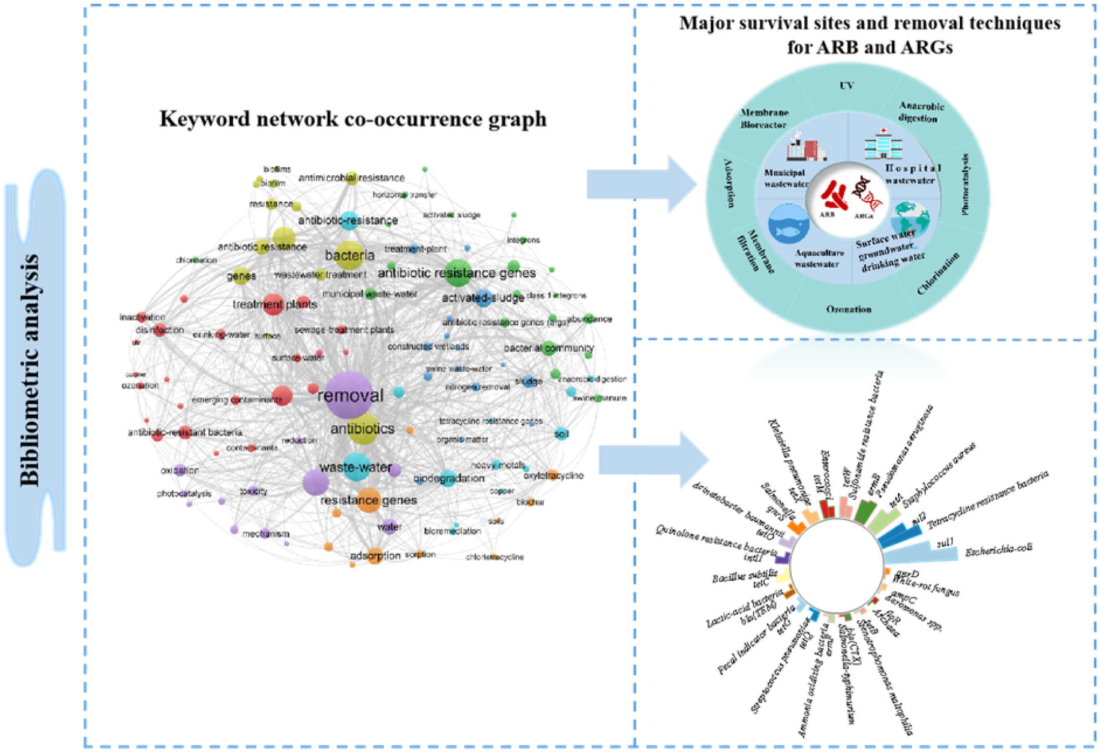 The spread of antibiotic resistance is a global threat, causing elevated death rates and economic costs. A growing number of studies have focused on the removal of antibiotic resistant bacteria (ARB) and antibiotic resistance genes (ARGs) in environmental settings. However, summaries and reviews of removal techniques are limited. This study examined publications on ARB and ARGs removal from 1998 to 2023 through a bibliometric approach based on the Web of Science database. Research progress during the past 26 years was analyzed by collecting annual publications, countries, journals and keywords. The number of articles related to the removal of ARB and ARGs has increased annually. The main types of ARB and ARGs, their environmental milieus and the most commonly studied removal techniques were summarized by keyword clustering. The results revealed that tetracycline- and sulfonamide-resistant bacteria are the ARB of greatest concern; that sul1, sul2, and tetA are the most frequently studied ARGs; and that municipal sewage and drinking water are the most studied ARB and ARGs transmission sites. For treatment techniques, adsorption technology is the most widely studied, and the selection of adsorption materials is particularly important, with nanomaterials and biomodified materials having great prospects for development. The combination of membrane filtration with advanced oxidation treatment or biodegradation technology is the most promising technology in this field. Our findings can inform future efforts to further reduce the distribution risks of antibiotic resistance and improve removal techniques.
