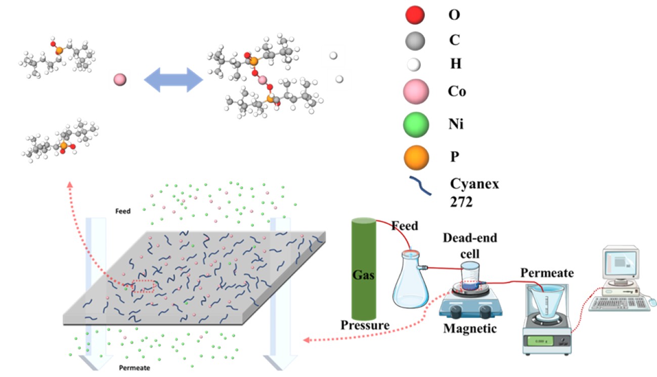 Liquid-liquid solvent extraction, commonly used for high purity Co(II) extraction, suffers from drawbacks such as environmental pollution and high cost. To overcome these challenges, a novel Cyanex 272 (bis(2,4,4-trimethyl pentyl)phosphinic acid, HCyanex) adsorptive membrane (CAM) was synthesized using the phase inversion method with varied Cyanex 272 loadings (0–52.5%) to extract Co(II) from cobalt-nickel mixed sulfate solution. Fourier transform infrared (FTIR) spectrometer, Scanning electron microscopy (SEM), and Energy dispersive X-ray spectroscopy (EDX) of as-prepared CAMs confirmed the successful and homogeneous blending of Cyanex 272 with poly(vinylidenefluoride) (PVDF), and increased pore sizes were observed with the addition of Cyanex 272. The highest Co (II) removal was achieved by the CAMs containing 33.2% weight percentage of Cyanex 272 to PVDF with a Langmuir sorption capacity of 1.42 mg/g. The extraction process for Co(II) and Ni(II) by CAMs was sensitive to pH and temperature, with an optimal separation factor of 209.5 at pH 6.8 and 75 °C. The adsorption process is endothermic. Additionally, the membrane exhibited excellent stability and durability, maintaining around 98% adsorption capacity after 20 cycles in the recycling process. These findings suggest that the as-prepared CAMs are a promising technology for the separation of Co(II) from Ni(II) in the recycling process of lithium-ion batteries.