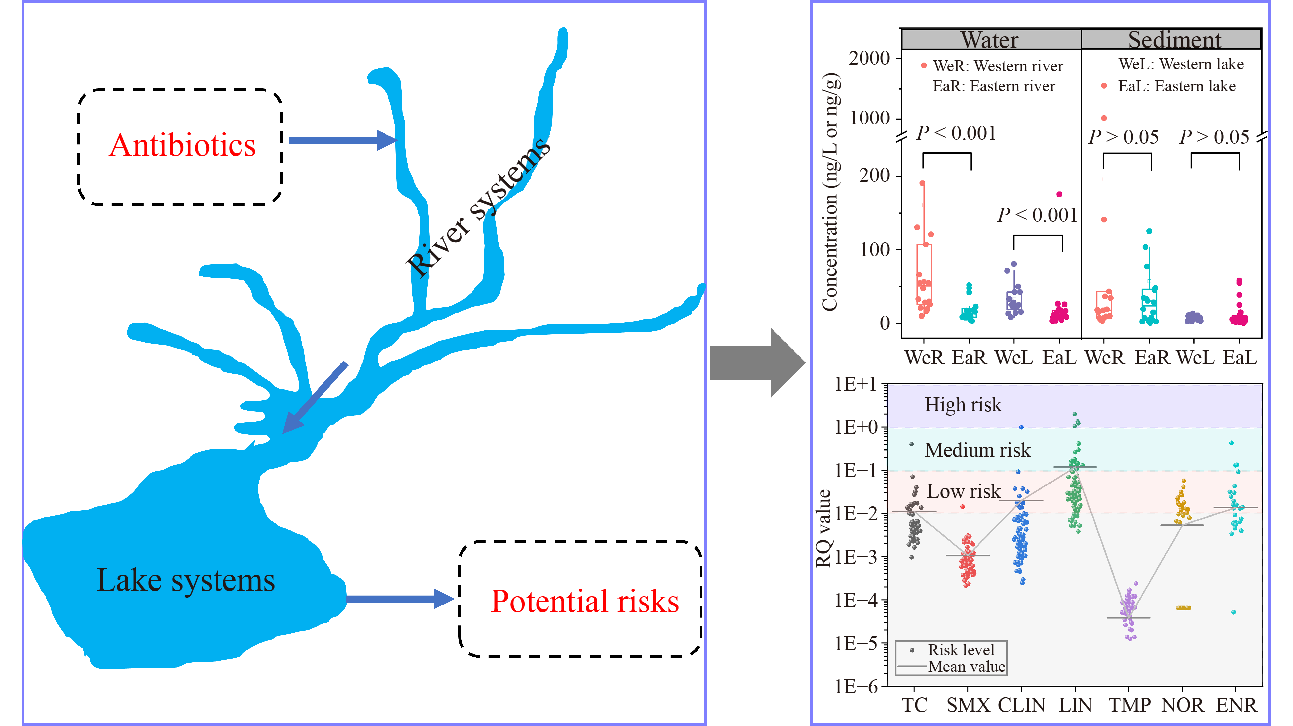The pollution of antibiotics in aquatic environments has received extensive attention. Yet, research on antibiotic contamination in river-lake systems, a significant form of modern aquatic environments, still needs to be explored. This study focuses on the Chaohu Basin (China) investigating the occurrence characteristics, influencing factors, and risk assessments of antibiotics in the river-lake system. The total antibiotic concentrations in the water phase and sediment phase were 3.14–1887.49 ng/L and 0.92–1553.75 ng/g, respectively. Clindamycin was the predominant antibiotic in the water phase, whereas tetracycline prevailed in the sediment phase. Notable differences in concentration and structural composition of antibiotics between the tributaries (river system) and Chaohu Lake were observed, indicating the involvement of various geochemical processes in the attenuation of antibiotics during transport to the receiving lake. Spatial analysis suggested that the western river is the primary source of antibiotics in Chaohu Lake. Controlling nutrient influx in heavily polluted areas is crucial to addressing the escalating issue of antibiotic pollution in the river-lake system. The widespread occurrence of clindamycin in the waters is likely due to wastewater treatment plant discharges, and high-intensity human activities continue to exacerbate antibiotic contamination. Risk assessment indicated that sulfamethoxazole, tetracycline, lincomycin, and clindamycin ranked in the top four with the highest risks to the most sensitive aquatic organisms. Nonetheless, the antibiotics presented no risk to consumer health. This study provides valuable insights for controlling antibiotic pollution in river-lake systems.
