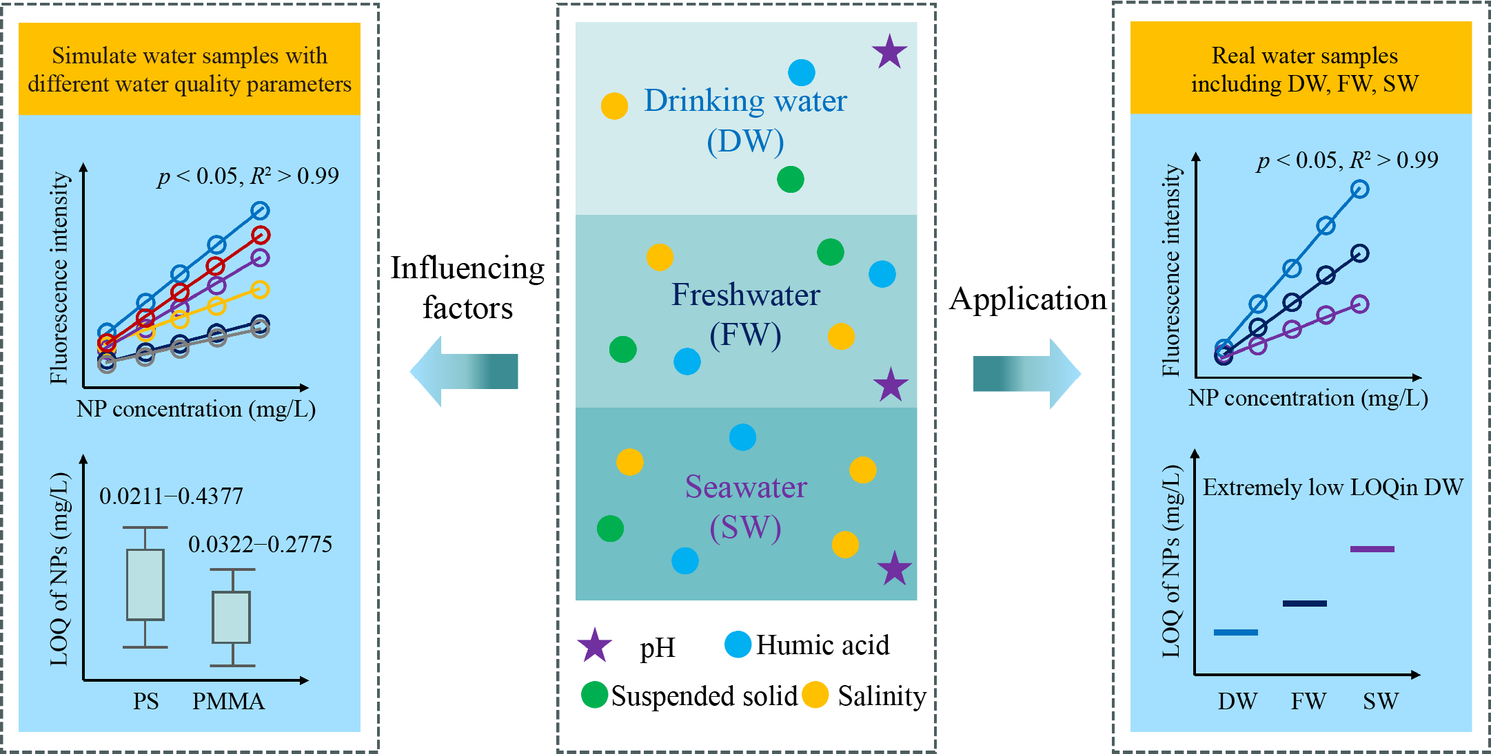 The thorough investigation of nanoplastics (NPs) in aqueous environments requires efficient and expeditious quantitative analytical methods that are sensitive to environmentally relevant NP concentrations and convenient to employ. Optical analysis-based quantitative methods have been acknowledged as effective and rapid approaches for quantifying NP concentrations in laboratory-scale studies. Herein, we compared three commonly used optical response indicators, namely fluorescence intensity (FI), ultraviolet absorbance, and turbidity, to assess their performance in quantifying NPs. Furthermore, orthogonal experiments were conducted to evaluate the influence of various water quality parameters on the preferred indicator-based quantification method. The results revealed that FI exhibits the highest correlation coefficient (> 0.99) with NP concentration. Notably, the limit of quantification (LOQ) for various types of NPs is exceptionally low, ranging from 0.0089 to 0.0584 mg/L in ultrapure water, well below environmentally relevant concentrations. Despite variations in water quality parameters such as pH, salinity, suspended solids (SS), and humic acid, a robust relationship between detectable FI and NP concentration was identified. However, an increased matrix, especially SS in water samples, results in an enhanced LOQ for NPs. Nevertheless, the quantitative method remains applicable in real water bodies, especially in drinking water, with NP LOQ as low as 0.0157–0.0711 mg/L. This exceeds the previously reported detectable concentration for 100 nm NPs at 40 μg/mL using surface-enhanced Raman spectroscopy. This study confirms the potential of FI as a reliable indicator for the rapid quantification of NPs in aqueous environments, offering substantial advantages in terms of both convenience and cost-effectiveness.