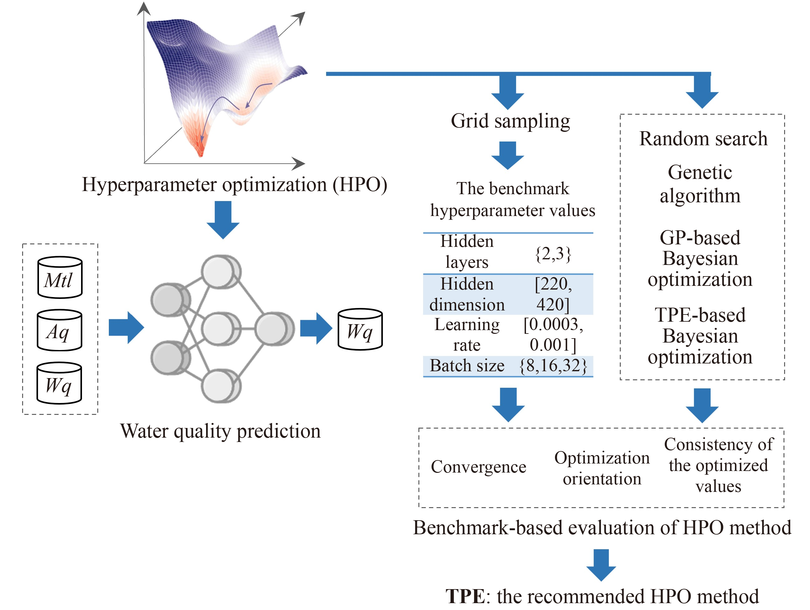● Manually adjustment of hyperparameters is highly random and computational expensive. ● Five HPO techniques were implemented in surface water quality prediction NN models. ● The proposed benchmark-based method for HPO evaluation is feasible and robust. ● TPE-based BO was the recommended HPO method for its satisfactory performance.