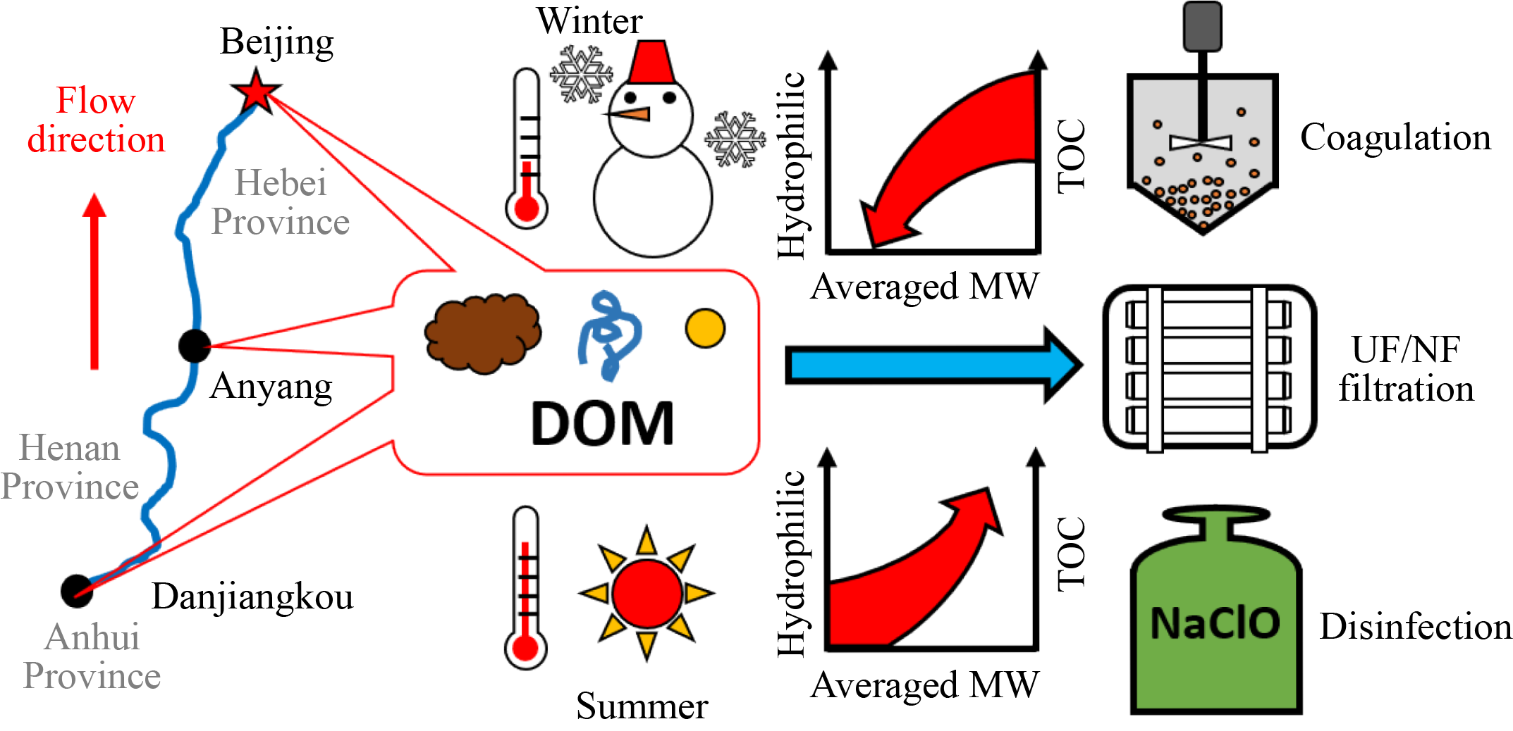 ● Variations of DOM in South-to-North Water Diversion is studied in winter and summer. ● Polysaccharides seriously fouled the UF membrane in summer. ● NF membrane fouling in winter was mainly caused by the DOM degradation products. ● DOM was more easily to form THMs in summer but HAAs in winter.