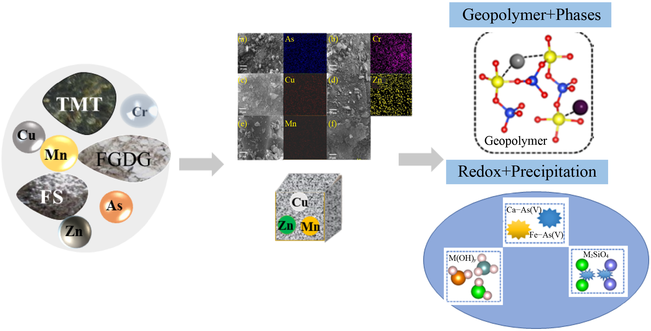 Tin mine tailings (TMT) and fuming slag (FS) contain many heavy metals (As, Cr, Cu, Zn and Mn) that cause severe pollution to the environment. Herein, geopolymers were prepared using TMT, FS and flue gas desulfurization gypsum (FGDG) to immobilize heavy metals, and their compressive strength and heavy metal leaching toxicity were investigated. It was first determined that T4F5 (TMT:FS = 4:5) sample exhibited the highest compressive strength (7.83 MPa). T4F5 achieved 95% immobilization efficiency for As and Cr, and nearly 100% for Cu, Zn and Mn, showing good immobilization performance. A series of characterization analyses showed that heavy metal cations can balance the charge in the geopolymer and replace Al in the geopolymer structure to form covalent bonds. In addition, about 2%–20% of heavy metal Fe was immobilized in hydration products, heavy metal hydroxides and non-bridging Si–O and Al–O coordination with silica-aluminate matrices. AsO33– was oxidized into AsO43–, which may form Ca–As or Fe–As precipitates. Cr2O72– was converted to CrO42– under alkaline environment and then combined with OH– to form Cr(OH)3 precipitates. Mn2+ may react directly with dissolved silicate to form Mn2SiO4 and also form Mn(OH)2 precipitates. The unstable Mn(OH)2 can be further oxidized to MnO2. The heavy metal cations were immobilized in the silicoaluminate lattice, while the anions tended to form insoluble precipitates. These results may benefit the industry and government for better handling of TMT, FS and solid wastes containing the abovementioned five heavy metals.