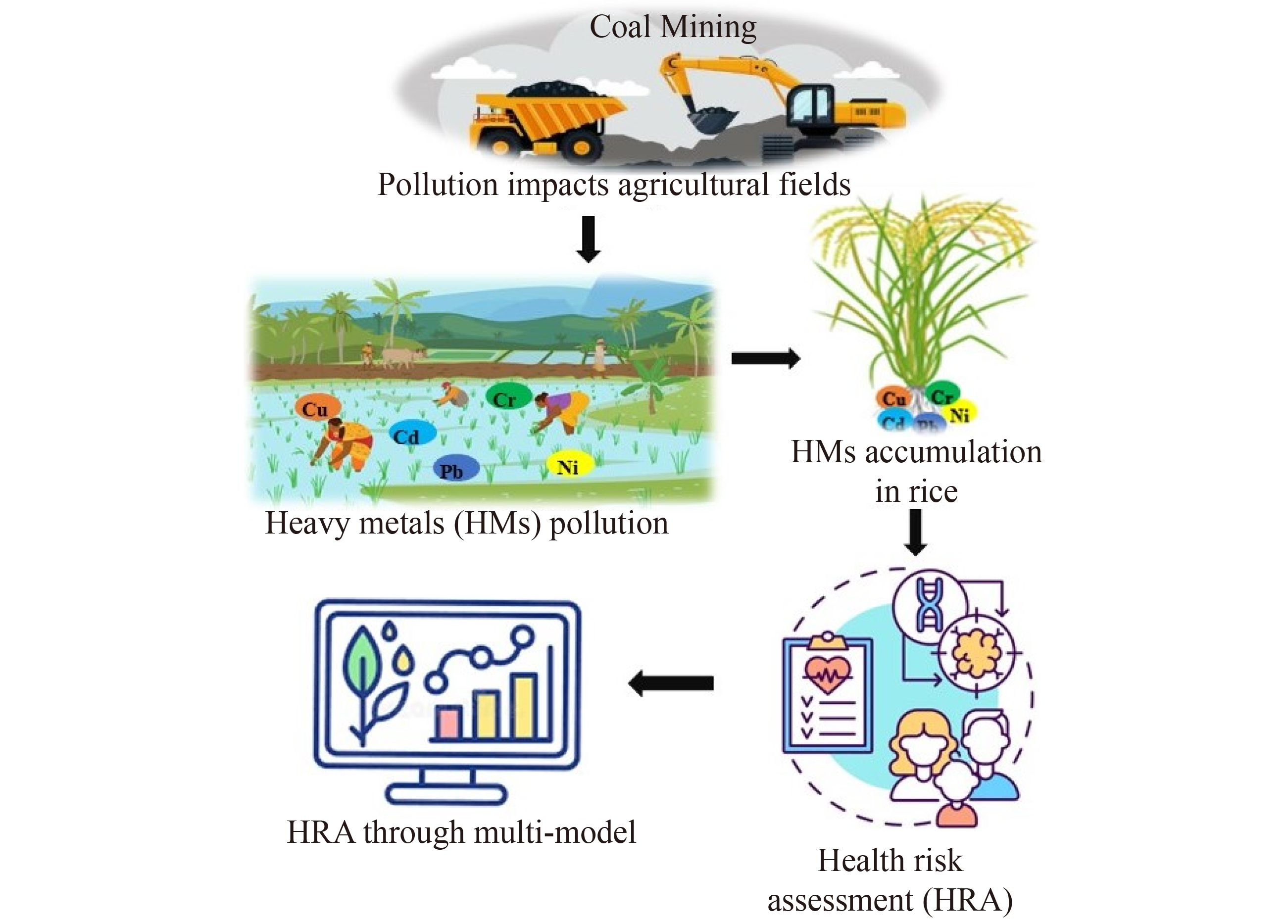 The present study assesses the concentration, probabilistic risk, source classification, and dietary risk arising from heavy metal (HMs) pollution in agricultural soils affected by coal mining in eastern part of India. Analyses of soil and rice plant indicated significantly elevated levels of HMs beyond the permissible limit in the contaminated zones (zone 1: PbSoil: 108.24 ± 72.97, CuSoil: 57.26 ± 23.91, CdSoil: 8.44 ± 2.76, CrSoil: 180.05 ± 46.90, NiSoil: 70.79 ± 25.06 mg/kg; PbGrain: 0.96 ± 0.8, CuGrain: 8.6 ± 5.1, CdGrain: 0.65 ± 0.42, CrGrain: 4.78 ± 1.89, NiGrain: 11.74 ± 4.38 mg/kg. zone 2: PbSoil: 139.56 ± 69.46, CuSoil: 69.89 ± 19.86, CdSoil: 8.95 ± 2.57, CrSoil: 245.46 ± 70.66, NiSoil: 95.46 ± 22.89 mg/kg; PbGrain: 1.27 ± 0.84, CuGrain: 7.9 ± 4.57, CdGrain: 0.76 ± 0.43, CrGrain: 8.6 ± 1.58, NiGrain: 11.50 ± 2.46 mg/kg) compared to the uncontaminated zone (zone 3). Carcinogenic and non-carcinogenic health risks were computed based on the HMs concentration in the soil and rice grain, with Pb, Cr, and Ni identified as posing a high risk to human health. Monte Carlo simulation, the solubility-free ion activity model (FIAM), and severity adjusted margin of exposure (SAMOE) were employed to predict health risk. FIAM hazard quotient (HQ) values for Ni, Cr, Cd, and Pb were > 1, indicating a significant non-carcinogenic risk. SAMOE (risk thermometer) results for contaminated zones ranged from low to moderate risk (CrSAMOE: 0.05, and NiSAMOE: 0.03). Fuzzy-TOPSIS and variable importance plots (from random forest) showed that Ni and Cr were mostly responsible for the toxicity in the rice plant, respectively. A self-organizing map for source classification revealed common origin for the studied HMs with zone 2 exhibiting the highest contamination. The positive matrix factorization model for the source apportionment identified coal mining and transportation as the predominant sources of HMs. Spatial distribution analysis indicated higher contamination near mining sites as compared to distant sampling sites. Consequently, this study will aid environmental scientists and policymakers controlling HM pollution in agricultural soils near coal mines.