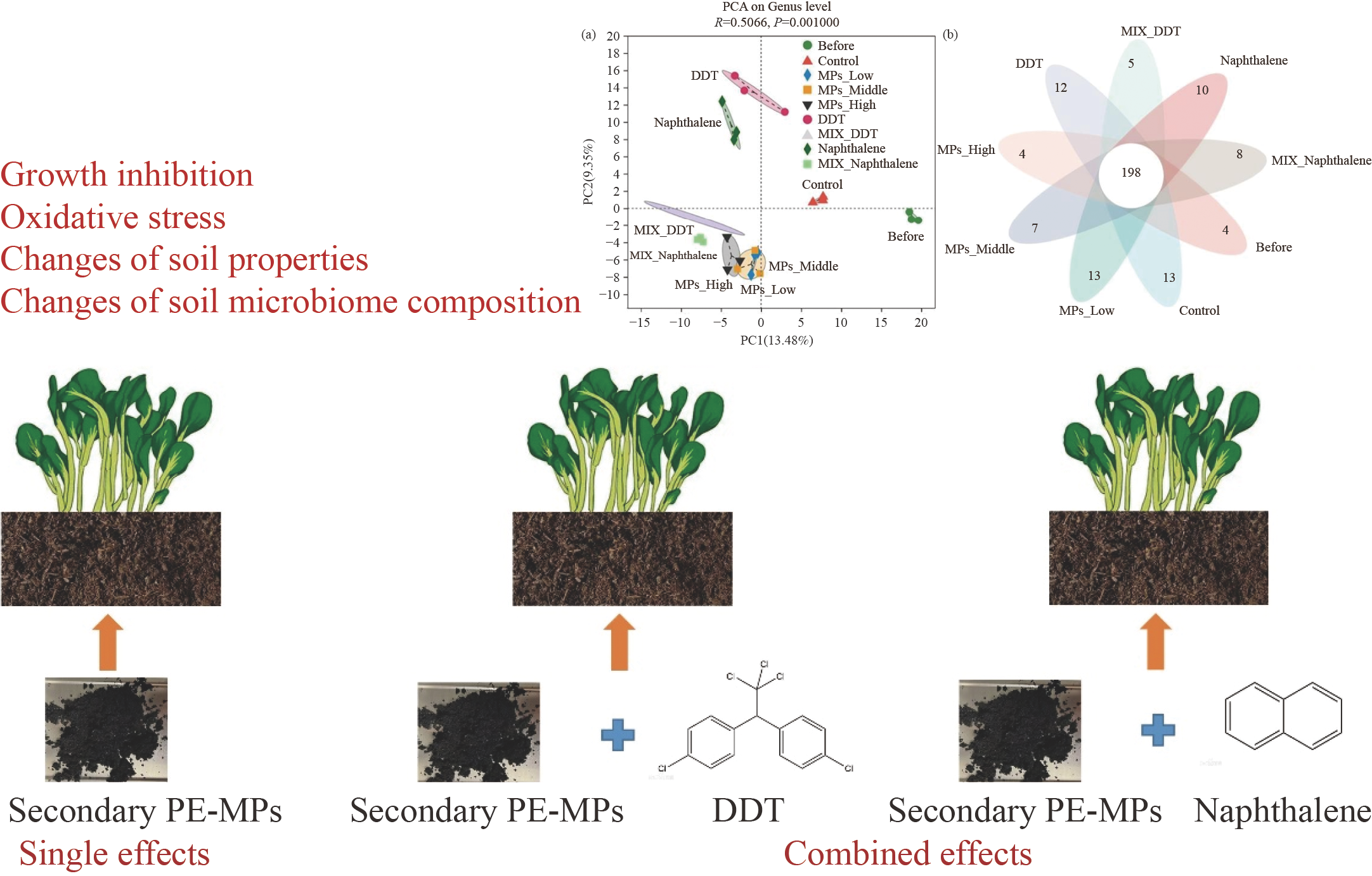 It has been confirmed that microplastics (MPs) are present in the environment. This study simulated secondary PE-MPs via aging and mechanical processes to evaluate their effects on Pak choi (Brassica rapa L.) over 21 d. Two common pollutants, dichlorodiphenyltrichloroethane (DDT) and naphthalene, were used in the combined toxicity tests. The results indicated that the growth of Pak choi was significantly inhibited after exposure to secondary PE-MPs, and the combined effects were antagonistic, owing to the adsorption capacity of secondary PE-MPs to DDT and naphthalene. Oxidative stress in Pak choi can be markedly affected, leading to oxidative damage to plant cells. The moisture content, soil bulk density, soil density, cation exchange capacity (CEC), and FDA hydrolase in the planted soils increased in the treated groups, and the TOC content changed significantly. We also found that the microbial composition of the soil in the DDT and naphthalene groups showed more significant alterations than that in the other groups. Alpha diversity analysis showed that species diversity increased in the combined groups but indicated a clear downward trend in the single MPs groups. This study suggests that secondary PE-MPs harm the growth of Pak choi and can change soil properties, revealing the harm to the ecosystem of MPs in the soil.
