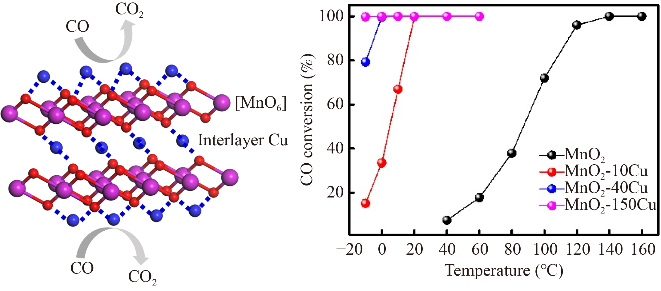 Copper intercalated birnessite MnO2 (δ-MnO2) with weak crystallinity and high specific surface area (421 m2/g) was synthesized by a one-pot redox method and investigated for low-temperature CO oxidation. The molar ratio of Cu/Mn was as high as 0.37, which greatly weakened the Mn-O bond and created a lot of low-temperature active oxygen species. In situ DRIFTS revealed strong bonding of copper ions with CO. As-synthesized MnO2-150Cu achieved 100% conversion of 250 ppm CO in normal air (3.1 ppm H2O) even at −10 °C under the weight-hourly space velocity (WHSV) of 150 L/(g·h). In addition, it showed high oxygen storage capacity to oxidize CO in inert atmosphere. Though the concurrent moisture in air significantly inhibited CO adsorption and its conversion at ambient temperature, MnO2-150Cu could stably convert CO in 1.3% moisture air at 70 °C owing to its great low-temperature activity and reduced competitive adsorption of water with increased temperature. This study discovers the excellent low-temperature activity of weakly crystallized δ-MnO2 induced by high content intercalated copper ions.