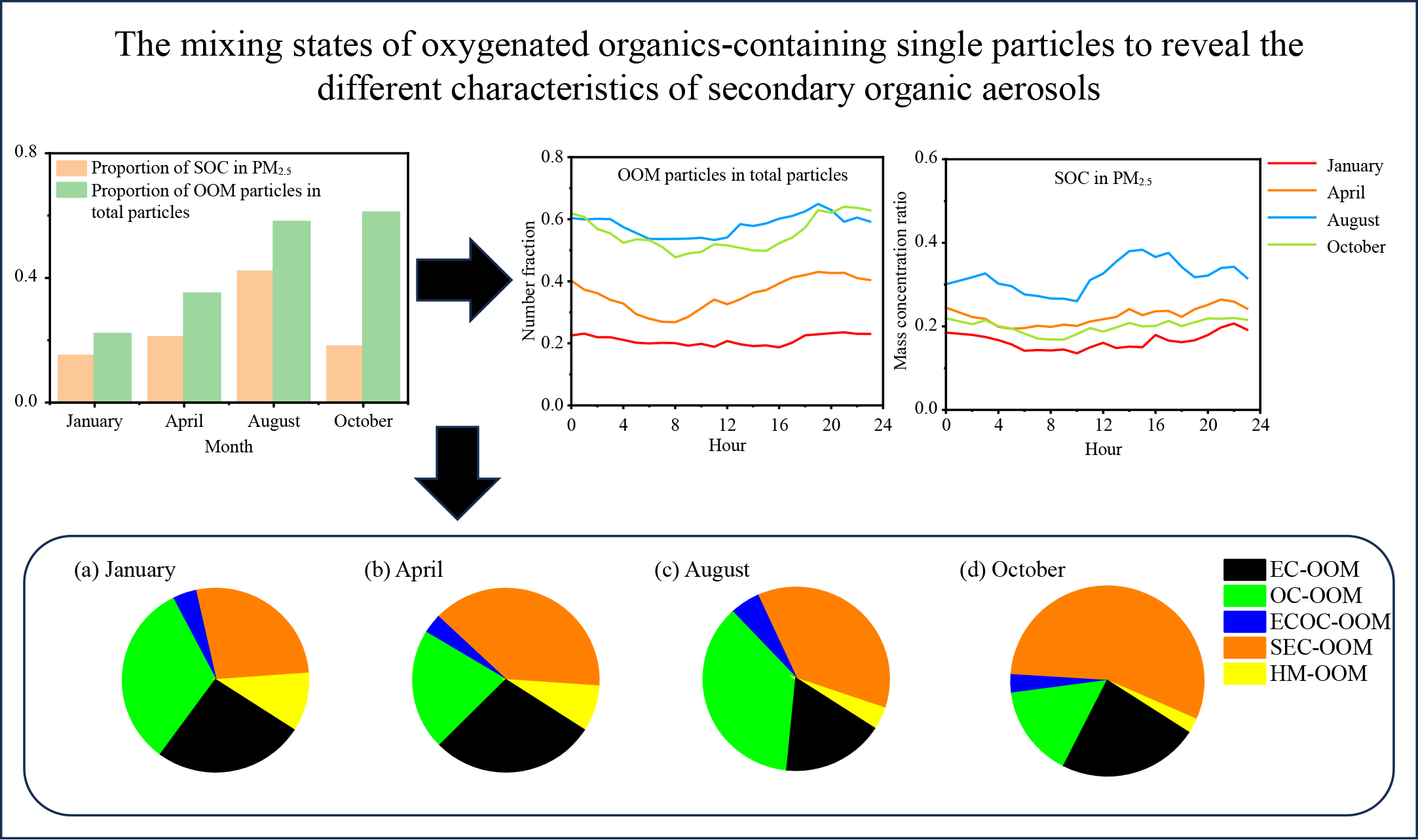 Oxygenated organic molecules (OOMs) play an important role in the formation of secondary organic aerosols (SOAs), but the mixing states of OOMs are still unclear. This study investigates the mixing states of OOM-containing single particles from the measurements taken using a single particle aerosol mass spectrometer in Guangzhou, China in 2022. Generally, the particle counts of OOM particles and the mass concentration of secondary organic carbon (SOC) exhibited similar temporal trends throughout the entire year. The OOM particles were consistently enriched in secondary ions, including 16O−, 26CN−, 46NO2−, 62NO3−, and 97HSO4−. In contrast, the number fractions and diurnal patterns of OOM particles among the total detected particles showed similar distributions in August and October; however, the SOC ratios in fine particulate matter were quite different, suggesting that there were different mixing states of single-particle oxygenated organics. In addition, further classification results indicated that the OOM particles were more aged in October than August, even though the SOC ratios were higher in August. Furthermore, the distribution of hydrocarbon fragments exhibited a notable decrease from January to October, emphasizing the more aged state of the organics in October. In addition, the sharp increase in elemental carbon (EC)-OOM particles in the afternoon in October suggests the potential role of EC in the aging process of organics. Overall, in contrast to the bulk analysis of SOC mass concentration, the mixing states of the OOM particles provide insights into the formation process of SOAs in field studies.