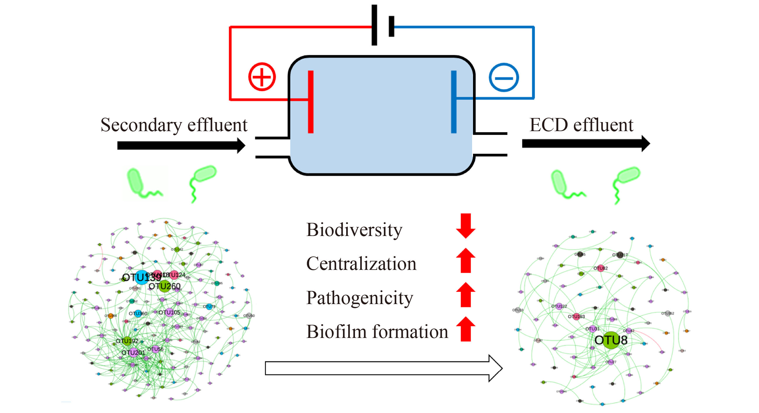 Electrochemical disinfection (ECD) is a promising disinfection technique for wastewater reclamation; however, the impacts of ECD on the microbiome in secondary effluent wastewater remain unknown. In this study, Propidium monoazide-qPCR (PMA-qPCR) and the plate count method were used to evaluate the inactivation performance, and the PMA-16S rRNA gene sequences of living cells were targeted to study the microbiome. A discrepancy was found between PMA-qPCR and the plate count method in the evaluation of cell count, with increases of 1.5 to 2.2 orders of magnitude in the disinfection rate after 150 s of disinfection. However, the cell count recovered and occasionally exceeded original levels within 3 d after disinfection. Biodiversity was suppressed after ECD, but the microbiome after 150 s disinfection retained a higher level of evenness and stability in the community with a median Shannon index (> 3.7). Pathogenic bacteria remained high in relative abundance even after 150 s of 25 V disinfection, but the biofilm-forming population was effectively suppressed by ECD. The co-occurrence network revealed a centralized and fragile network as disinfection persisted, demonstrating the destabilizing effects of ECD on the microbiome. Functional pathways for cell membrane synthesis and organic compound degradation were enriched after ECD. The reaction of the microbiome after ECD was similar to other disinfection techniques in terms of community structure.