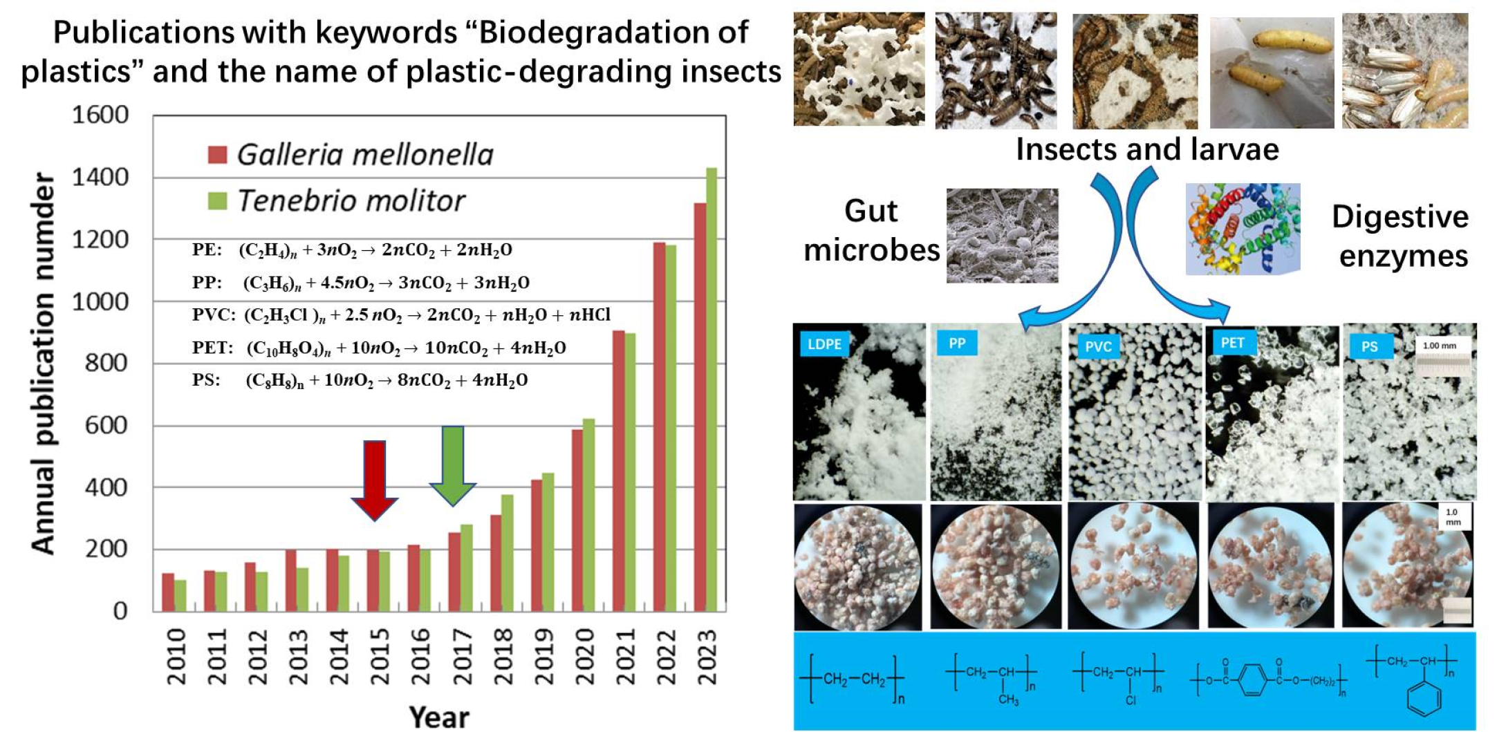 ● Insect damaging and penetrating plastic materials has been observed since 1950s. ● Biodegradation of plastics by insects has become hot research frontiers. ● All major plastics can be biodegraded with half-live on hourly basis. ● The biodegradation is performed by the insect hosts together with gut microbiota. ● Future perspectives focus on biodegradation mechanisms and potential applications.