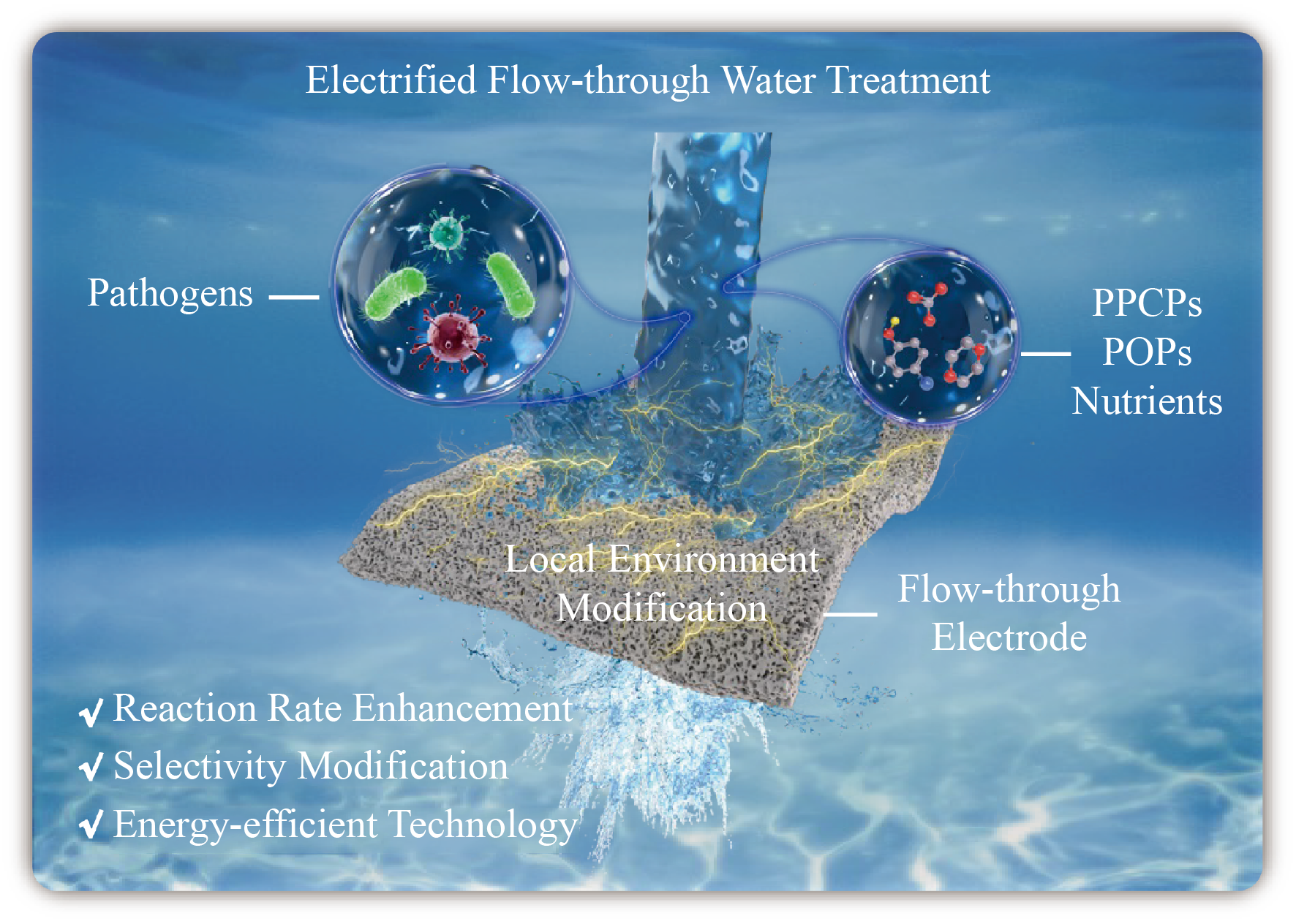 ● Modifying local environment can intensify the performance of flow-through electrodes. ● Reaction rate and selectivity can be improved by local environment modification. ● Modifications include spatial confinement, enhanced local field, and periodic vortex. ● Near-complete removal of low-concentration emerging contaminants can be realized. ● Electrified flow-through systems are promising for fit-for-purpose water treatment.