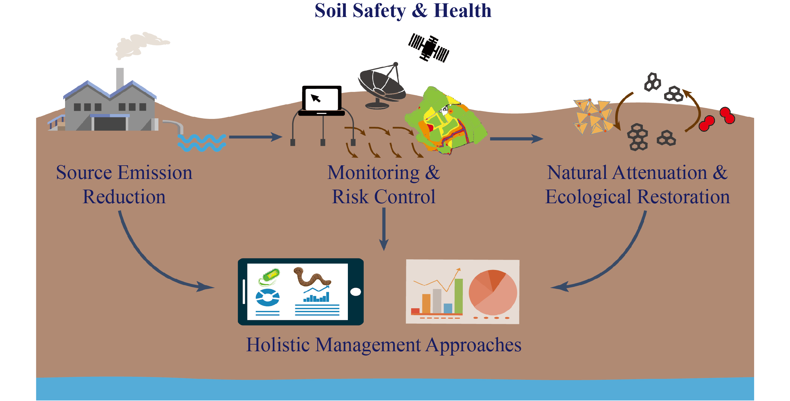 Soil is a non-renewable resource, providing a majority of the world’s food and fiber while serving as a vital carbon reservoir. However, the health of soil faces global threats from human activities, particularly widespread contamination by industrial chemicals. Existing physical, chemical, and biological remediation approaches encounter challenges in preserving soil structure and function throughout the remediation process, as well as addressing the complexities of soil contamination on a regional scale. Viable solutions encompass monitoring and simulating soil processes, with a focus on utilizing big data to bridge micro-scale and macro-scale processes. Additionally, reducing pollutant emissions to soil is paramount due to the significant challenges associated with removing contaminants once they have entered the soil, coupled with the high economic costs of remediation. Further, it is imperative to implement advanced remediation technologies, such as monitored natural attenuation, and embrace holistic soil management approaches that involve regulatory frameworks, soil health indicators, and soil safety monitoring platforms. Safeguarding the enduring health and resilience of soils necessitates a blend of interdisciplinary research, technological innovation, and collaborative initiatives.