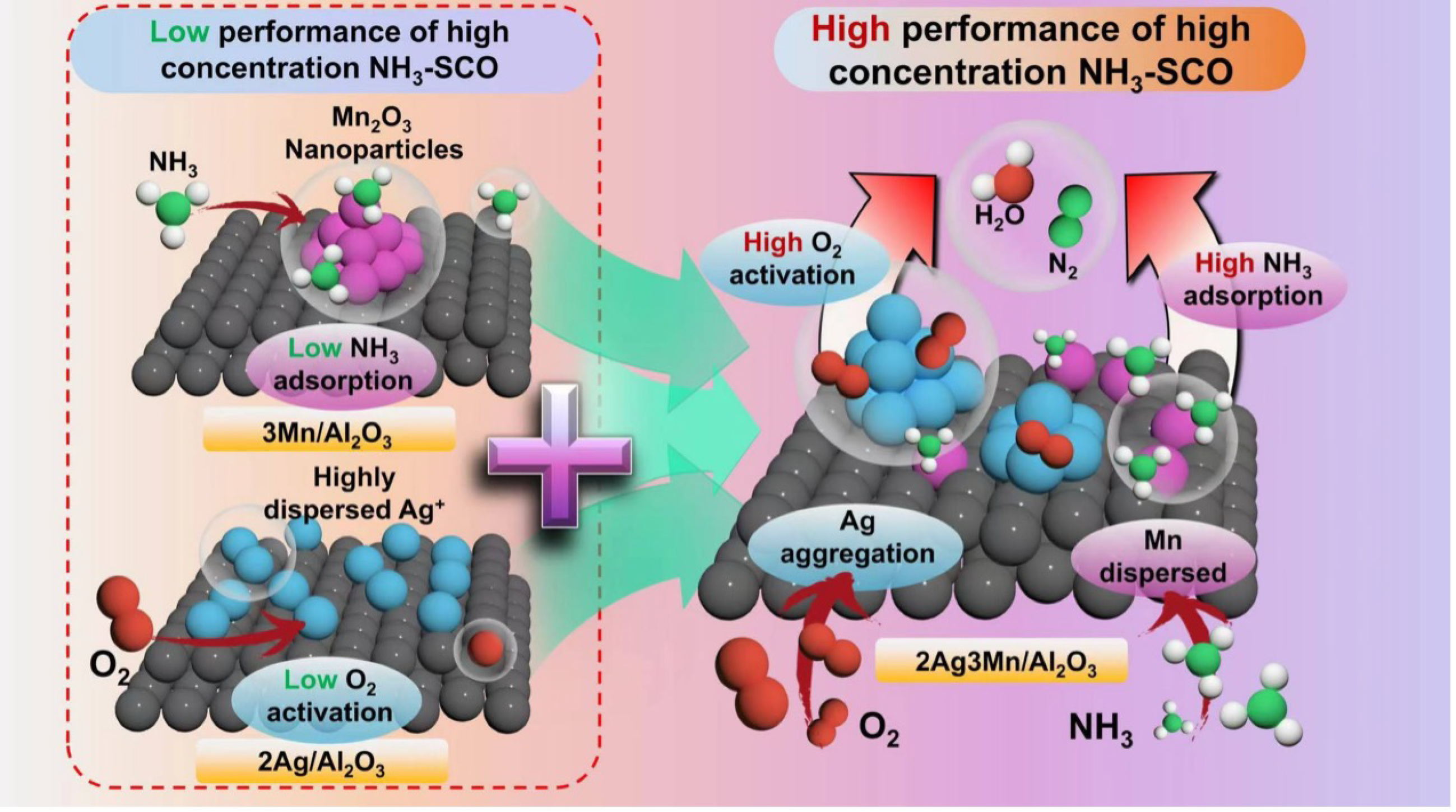 Ammonia fuel, as a promising zero-carbon energy carrier, faces environmental challenges due to high-concentration NH3 slip in exhaust emissions. Here we develop an efficient Ag-Mn/Al2O3 bimetallic catalyst for NH3 selective catalytic oxidation (NH3-SCO). Mechanistic investigations reveal the dual role of Mn in this catalytic system: On one hand, Mn preferentially occupies the hydroxyl anchoring sites on Al2O3 surface, inducing Ag species aggregation to form nanoparticles with superior O2 activation capability; on the other hand, highly dispersed Mn species provide abundant Lewis acid sites, significantly enhancing NH3 adsorption and activation. Through this synergistic effect, the 2Ag3Mn/Al2O3 catalyst achieves complete conversion of 7.5 mg/L NH3 at 300 °C. Further studies demonstrate a distinct temperature-dependent effect on the catalyst’s reaction mechanism, transitioning from –NH-dominated pathway at low temperatures to i-SCR mechanism at high temperatures. This work not only elucidates the mechanism of Mn’s dual role in structural regulation and functional sites but also provides new insights into the rational design of efficient NH3-SCO catalysts.