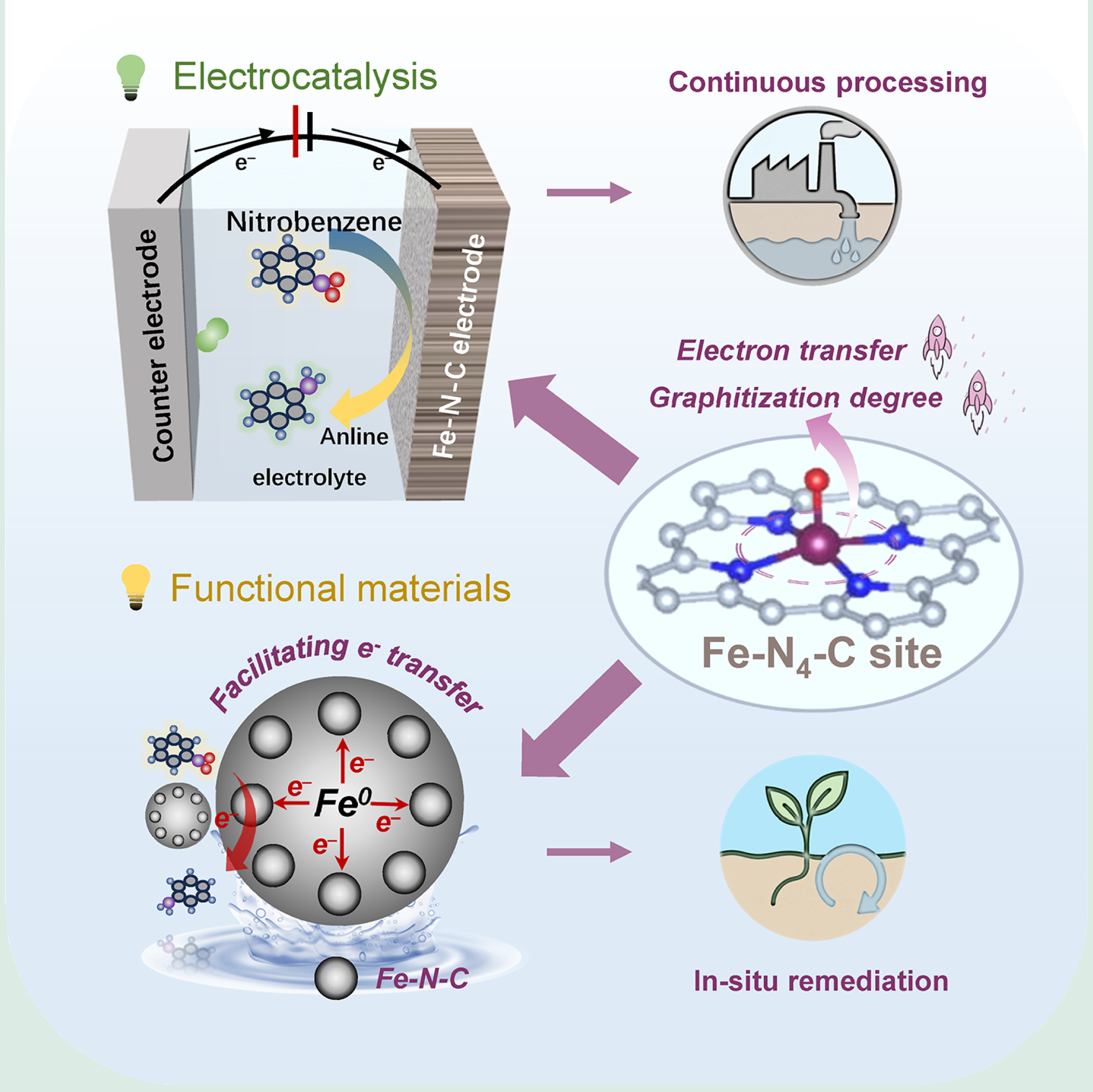 The remediation of nitroaromatic-contaminated water systems remains a critical environmental challenge, creating the urgent need for cost-effective, non-precious metal catalysts to increase wastewater biodegradability. In this study, we present an Fe/N-functionalized three-dimensional porous carbon (Fe–N–C) catalyst synthesized via a straightforward pyrolysis approach that enables efficient nitrobenzene (NB) degradation via electrochemical and chemical reduction pathways. The high-temperature pyrolysis process facilitates the iron-catalyzed reconstruction of the carbon matrix, resulting in a hierarchically porous structure with increased graphitization and uniformly distributed macrocyclic Fe–N4 coordination sites. These structural features give the Fe–N–C catalyst exceptional electron transfer kinetics, catalytic activity, and pH adaptability, surpassing conventional graphite (GR) and nitrogen-doped carbons (NPCs) in NB reduction. Systematic evaluation of the electrochemical reduction performance revealed that the Fe–N–C electrode achieved the highest NB removal efficiency. To further assess the versatility of the catalyst, a functionalized Fe–N–C/zero-valent iron (ZVI) composite was engineered by integrating Fe–N–C as a catalytic layer onto the reductant ZVI. Compared with ZVI alone, this composite markedly increased the NB reduction efficiency. These findings provide valuable insights into the electrochemical reduction process of Fe–N–C and new directions for the rational design of efficient nitrobenzene reduction systems.