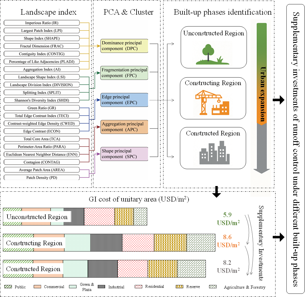 Rapid urbanization reshapes landscape patterns and intensifies stormwater runoff pressure, yet the shifting cost-effectiveness of green infrastructure across different urban development phases remains poorly quantified. Focusing on Beijing’s 150 km2 urban subcenter, this study quantified 21 block-level landscape metrics, which were distilled via principal component analysis into five landform indicators: dominance, fragmentation, edge, aggregation, and shape. K-means clustering classified each block into constructed, constructing, or unconstructed phases. A life-cycle cost analysis then estimated the bioretention investment required to meet an 80%–85% annual runoff volume control target. The constructing phase, characterized by contiguous impervious surfaces at the urban edge, demands 45% more bioretention investment per unit area than the unconstructed phase and 4% more than the constructed phase. As land transitions from unconstructed to constructed, bioretention costs increase by approximately 109% for agricultural land and 86% for green space, whereas changes for residential and commercial areas remain minimal. These results indicate that uniform runoff control investment policies risk underfunding rapidly developing fringes and overfunding consolidated urban centers. A phase-specific and land use–sensitive investment strategy is therefore necessary to avoid capital inefficiency while achieving runoff control goals. By linking dynamic landscape evolution with infrastructure economics, this study provides a forward-looking tool to guide runoff control investment during urban expansion.