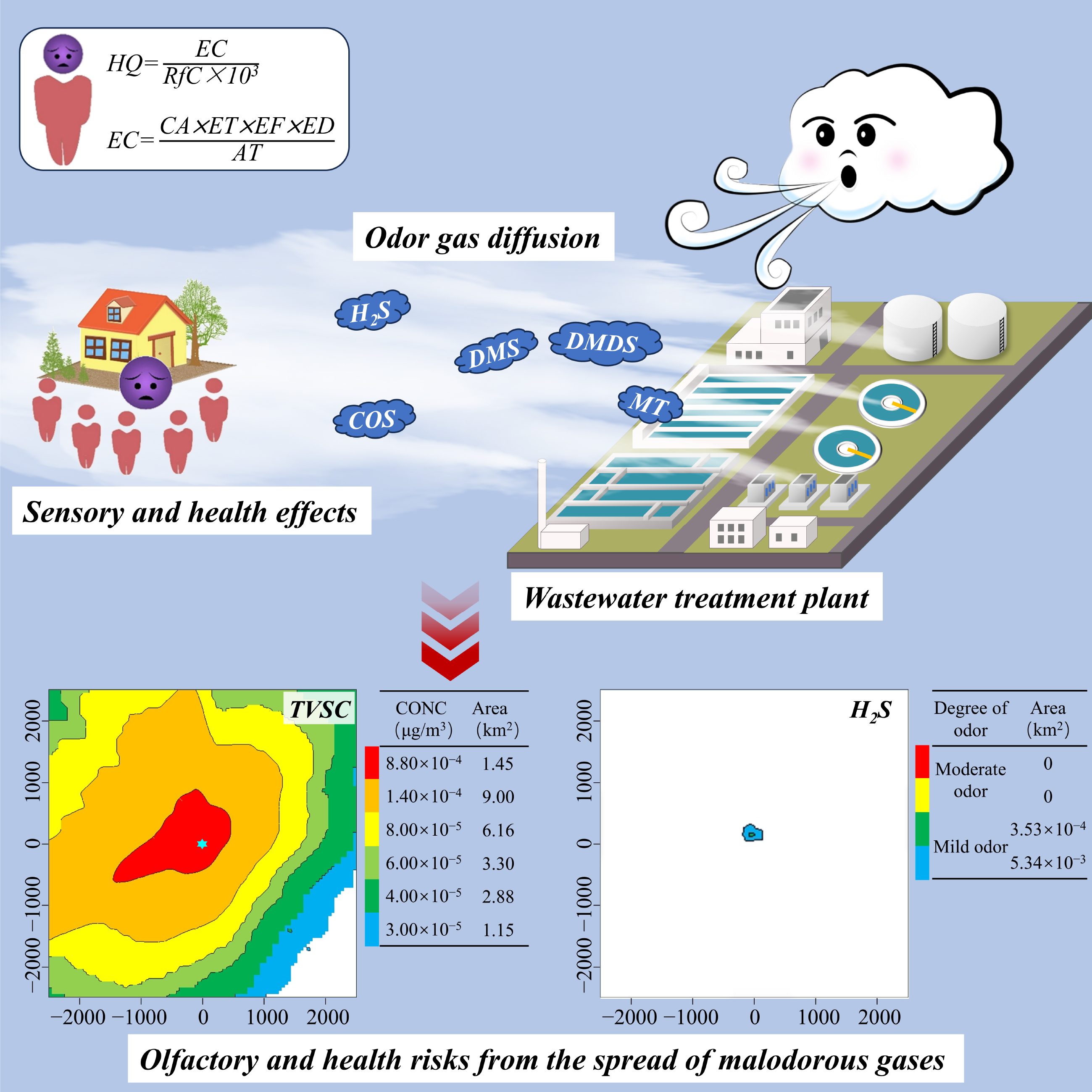 The emissions of volatile sulfur compounds (VSCs) from wastewater treatment plants (WWTPs) pose odor nuisances and health risks to workers and surrounding residents, thus becoming a major environmental concern for these facilities. This study investigated the long-term monitoring of emissions of VSCs from an anaerobic/oxic (A/O) WWTP and employed the AERMOD model to simulate the dispersion of VSCs within an area of 5 × 5 km2 for assessing the impact of these emissions on odor and health risks. The obtained results indicated that the emissions of VSCs from the WWTP decreased in the order of summer > autumn > spring > winter. The pretreatment unit accounted for 90.72% of the total VSCs emissions. The dispersion of VSCs was significantly influenced by the direction and speed of wind, with the largest dispersion range observed in autumn and the smallest one in spring. Dimethyl disulfide (DMDS), dimethyl sulfide (DMS), and hydrogen sulfide (H2S) were identified as the primary VSCs contributing to odor impacts. The source tracing analysis revealed that the fugitive emissions of VSCs from the grill and sand-water separation unit (SWSU) contributed most significantly to their dispersion, odor pollution, and health risks, accounting for 74.87% and 11.33%, respectively. Enclosure of the grill and SWSU with covers, adjustment of the position of the exhaust pipe of the deodorizing facility, and increment in the height of the exhaust pipe are expected to be effective measures in mitigating the negative impacts of VSCs. These measures would provide new insights into dispersion modelling, risk prediction, and emission control of gaseous pollutant emitted from other factories.