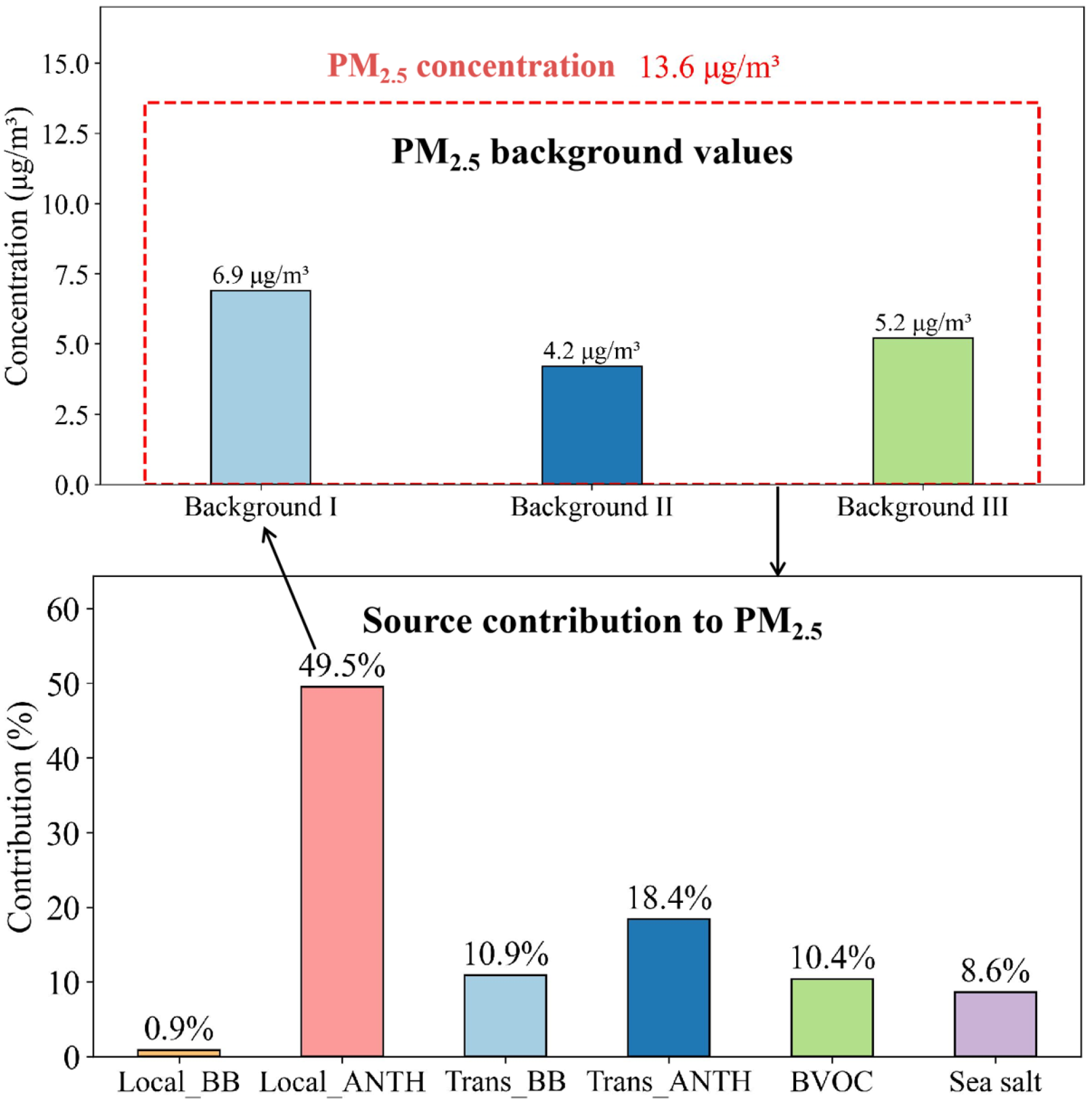 As a national ecological civilization pilot zone with unprecedented strategic importance in China, Hainan Province requires precise identification of PM2.5 background concentrations to achieve world-leading air quality objectives. This study utilized the three-dimensional regional air quality modeling (WRF-CMAQ) and integrated multi-source ground observation data for model validation. To quantify the PM2.5 background values for Hainan, representing concentrations largely influenced by natural emissions and regional transport, we determined the contributions from these sources. The results identified local anthropogenic emissions (49.5%) and regional transport (29.3%) as the dominant PM2.5 sources in Hainan, with important natural contributions (19.0%). Based on the theoretical definition of background concentrations grounded in scientific research and the objective of providing practical policy insights for Hainan, the PM2.5 background values were defined as the PM2.5 concentration after (1) excluding local anthropogenic emissions; (2) excluding anthropogenic emissions across Hainan and its surrounding regions; and (3) excluding local emissions combined with projected 2035 emission scenarios for surrounding areas. Based on these three definition methods, the 18 cities-averaged PM2.5 background values for Hainan were determined as 6.9, 4.2, and 5.2 μg/m3, while the corresponding grid-averaged values calculated were 6.7, 4.6, and 4.9 μg/m3, respectively. Accounting for meteorological fluctuations could yield lower estimated PM2.5 concentrations for Hainan. Hainan’s PM2.5 background values showed comparability with levels documented in clean island areas globally. Our study demonstrated that Hainan maintained a relatively low PM2.5 background level, showing substantial emission reduction potential. Through implementation of effective control measures, Hainan is projected to achieve world-leading air quality by 2035.