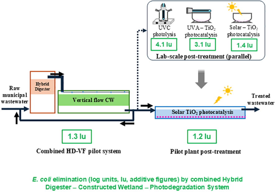 A combined system comprising a hybrid anaerobic digester (HD), a vertical subsurface flow constructed wetland (VF), and a heterogeneous photocatalysis unit was evaluated at pilot-scale for the elimination of faecal indicator microorganisms—total coliforms, Escherichia coli and Clostridium perfringens. The VF effluent was subjected to laboratory-scale experiments using different photodegradation post-treatments: UVC photolysis, heterogeneous photocatalysis with ultraviolet light (UVA/TiO2), and sunlight-driven heterogeneous photocatalysis (Sol/TiO2). Subsequently, the Sol/TiO2 system was scaled up and implemented at pilot-scale (p.Sol/TiO2). The total footprint of the combined HD+VF+p.Sol/TiO2 system was 4.4 m2. Under continuous operation, the combined HD+VF system was able to remove approximately 1.0, 1.3 and 1.1 log units for total coliforms, E. coli and C. perfringens, respectively, with the VF unit accounting for more than 80% of the overall elimination during biological treatment. Laboratory-scale experiments showed high removal efficiency, following the order UVC > UVA/TiO2 > Sol/TiO2. In contrast, the p.Sol/TiO2 post-treatment (after 2 h of exposure) achieved lower removals of approximately 0.5, 1.2 and 0.1 log units for total coliforms, E. coli and C. perfringens, respectively. To our knowledge, this is the first study on the combination of VF constructed wetlands and photodegradation processes with the aim of improving the quality of reclaimed water for potential reuse. As a general conclusion, the photocatalysis pond employed in the present study improved the quality of the VF effluent, widening the possibilities for reuse of the reclaimed water.
