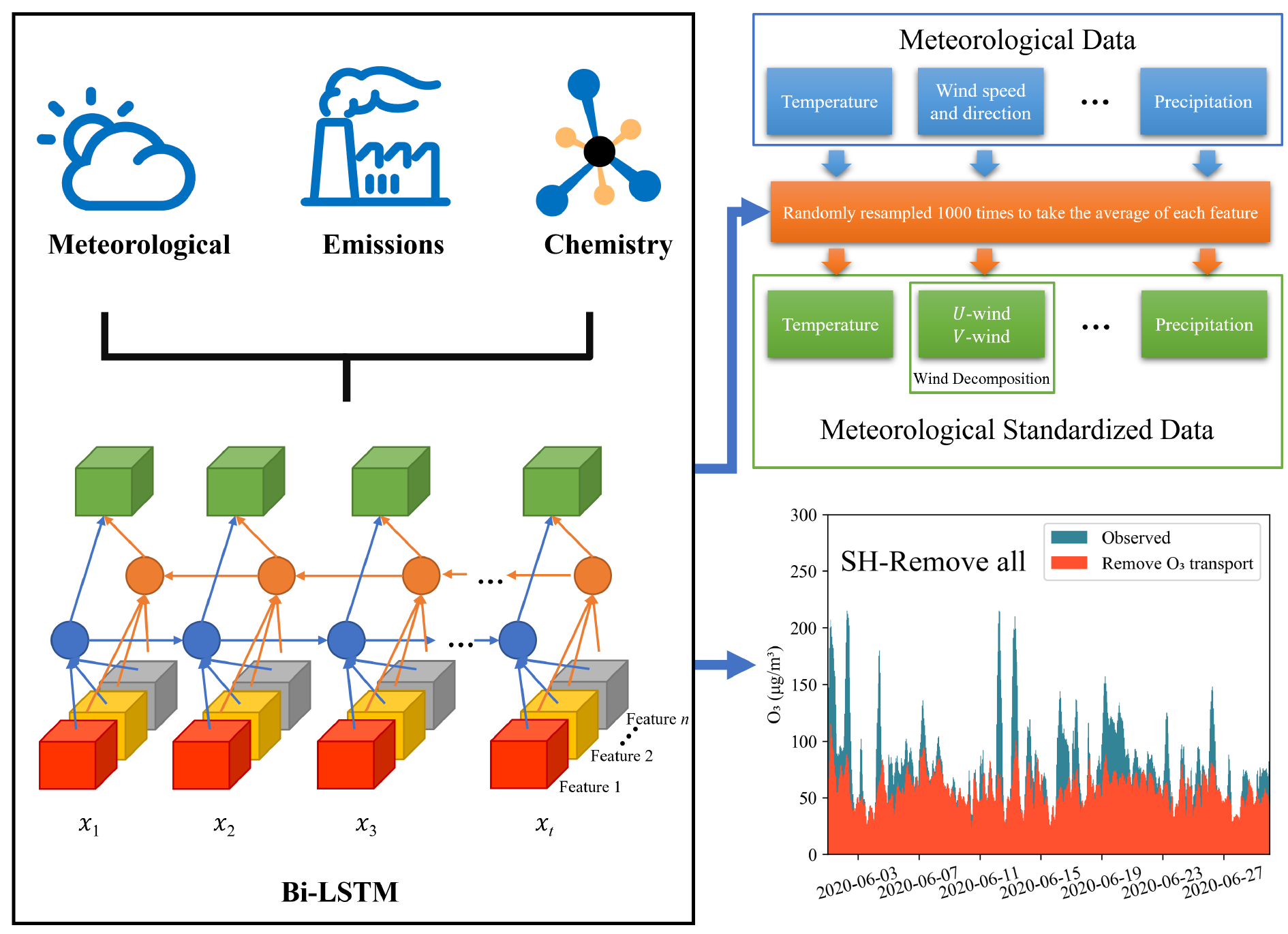Severe ozone (O3) pollution has always been a serious problem faced by areas with rapid economic development, and the regional O3 transport between cities is a major cause of this problem. Therefore, we used a bidirectional long short-term memory (Bi-LSTM) model to quantitatively identify the regional O3 transport in Hangzhou Bay, China. Combined with the meteorological removal method, we were able to model O3 concentrations that were not affected by transport. The contribution of regional transport to Shanghai’s O3 was quantified and validated using two different simulation schemes, which yielded highly consistent results of 18.41 μg/m3 (24% contribution) and 20.52 μg/m3 (27% contribution). According to the model simulation results, we found that approximately 24% of the O3 pollution in Shanghai originates from other cities in the summer when the O3 pollution is high. In addition, the regional O3 transport was mainly concentrated during the high-value weather of O3 pollution in Shanghai, and transport on non-pollution days was not apparent. Therefore, the regional O3 transport from other cities is an important source of O3 pollution in Shanghai. Overall, our study demonstrates the potential of machine-learning models coupled with meteorological removal for quantifying the inter-city influence of atmospheric pollutants.