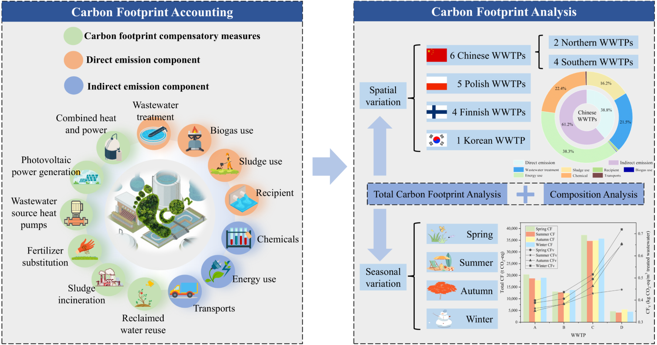 The wastewater treatment sector contributes to greenhouse gas emissions, thereby exacerbating global warming. Achieving net-zero emissions in wastewater treatment plants (WWTPs) is pivotal to meeting carbon neutrality targets. This study evaluated the carbon footprint (CF) of six representative WWTPs in southern and northern China to elucidate the current status of carbon neutrality. The analysis covered CF composition, offsets achieved through carbon compensatory measures, and the CF seasonal and spatial variations. The average CF per population equivalent of the selected Chinese WWTPs with offsets was 58 kg CO2-eq/PE/yr, representing a 22.8% reduction compared with the pre-offset value. Energy recovery from sludge incineration and reclaimed water reuse emerged as the vital carbon offset strategies for the studied facilities in southern and northern China, respectively. Unlike those in typical European WWTPs, indirect emissions driven by substantial electricity and chemical consumption were the primary CF sources in Chinese plants (> 60%). When pollutants removed were used as the functional unit, peak CF values were observed during summer or autumn. Energy input was determined to be the primary factor influencing the CF. Further CF reductions can be realized through process optimization, energy recovery, and chemical reduction, and other measures. This study provides a valuable reference for formulating targeted mitigation strategies in WWTPs and advancing towards carbon neutrality.