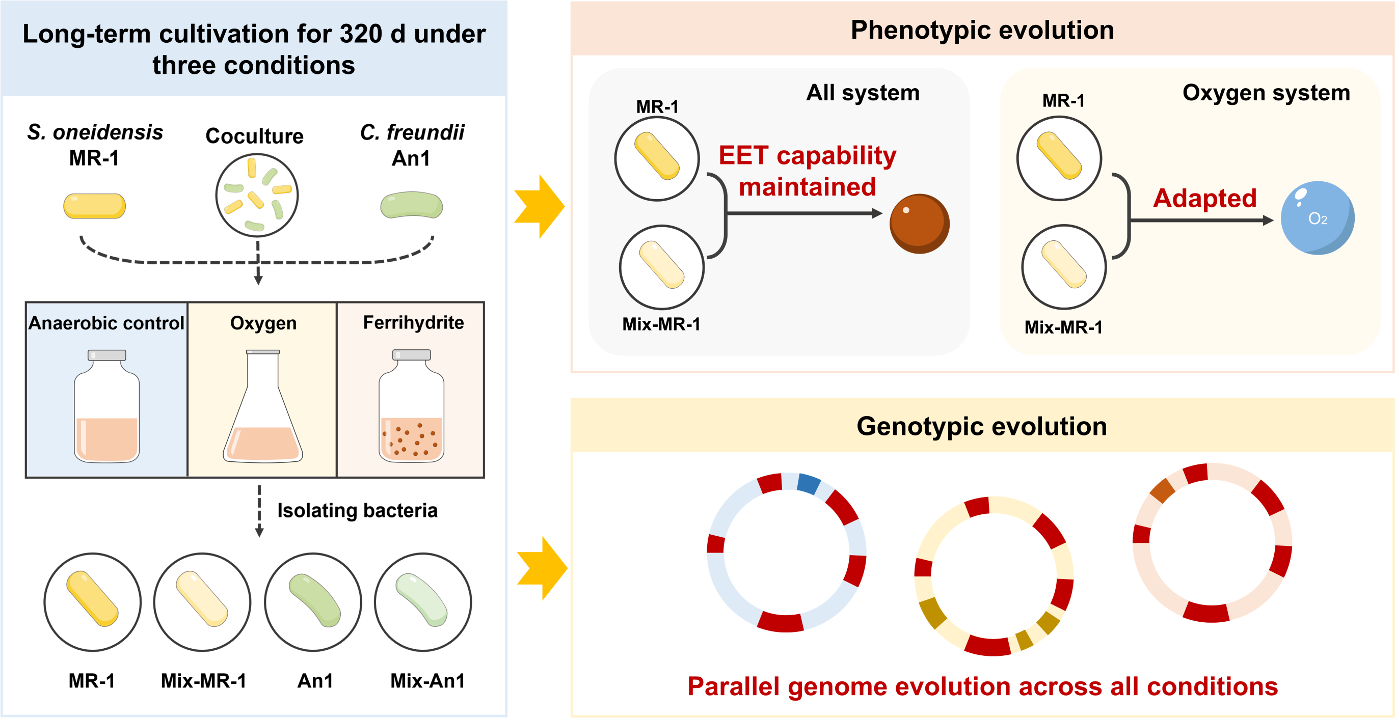 Electroactive microorganisms are integral to biogeochemical cycles through extracellular electron transfer and have potential applications in environmental remediation. However, their long-term competitive interactions and evolutionary dynamics with non-electroactive microorganisms remain poorly understood. In this study, we conducted a 320-day cultivation experiment in which monocultures of the electroactive Shewanella oneidensis MR-1, the non-electroactive Citrobacter freundii An1, and their cocultures were compared under three single electron acceptor conditions: anaerobic (no exogenous electron acceptor), ferrihydrite, or oxygen. After 320 d, S. oneidensis MR-1 presented the highest relative abundance of 30.94% ± 0.74% in the ferrihydrite cocultures. S. oneidensis MR-1 maintained ferrihydrite reduction capacity after cultivation under all three conditions, indicating the long-term stability of its extracellular electron transfer. Moreover, no other phenotypic evolution was observed in S. oneidensis MR-1 after ferrihydrite or anaerobic cultivation. In contrast, both monocultured and cocultured S. oneidensis MR-1 exhibited enhanced adaptation to oxygen, characterized by increased growth rates, metabolic activity, and reduced cell aggregation. Notably, substrate consumption increased in monocultures but decreased in cocultures, suggesting an optimization of metabolic efficiency in the latter. Genome sequencing revealed mutations in genes associated with cell division, adenosine triphosphate synthesis, lactate metabolism, and flagellar/pilus expression in S. oneidensis MR-1. Interestingly, the ferrihydrite-adapted groups also exhibited enhanced adaptation to oxygen. 83.96% of mutations were shared across all culture systems and enriched in environmental signal-sensing pathways, indicating that parallel genomic evolution facilitated cross-environmental adaptation. Our findings reveal the ecological evolution of electroactive microorganisms in diverse redox environments and establish a foundation for engineering electroactive communities.