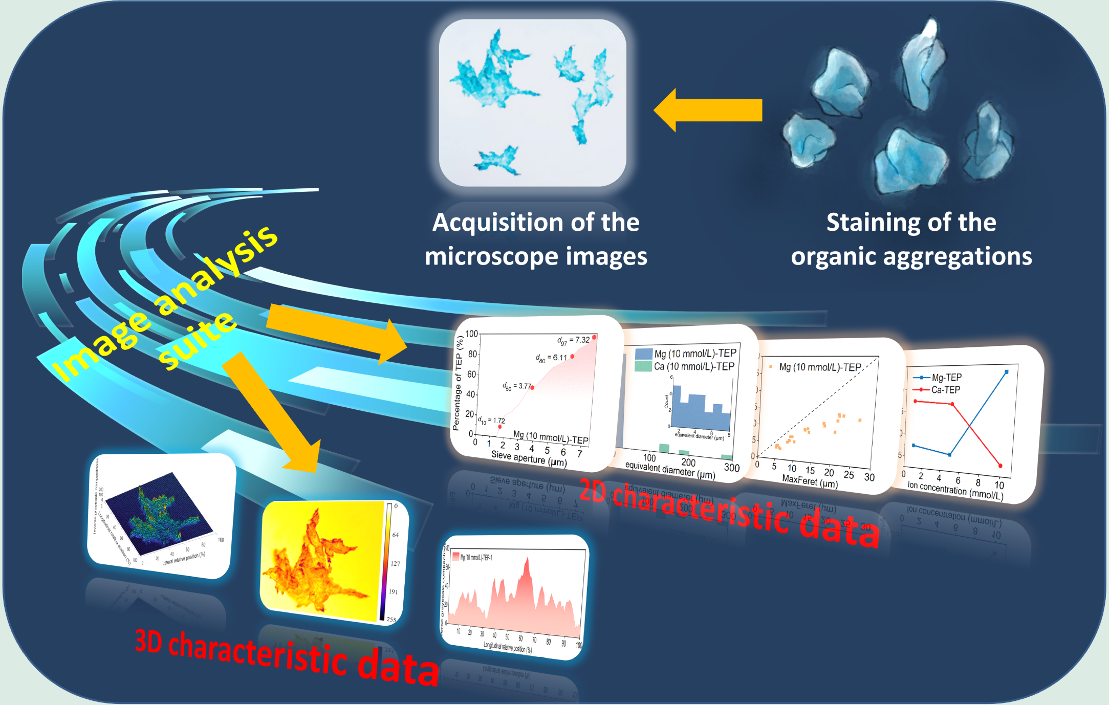 Transparent exopolymer particles (TEP) are abundant gel-like colloids pivotal in marine carbon cycling and water treatment processes. Their environmental roles are governed by hierarchical architectures, yet in-situ structural characterization remains challenging due to transparency, fragility, and polymorphism. To address this, we developed an integrated image analysis suite combining advanced processing with statistical modeling, enabling simultaneous 2D/3D quantification of TEP morphology and intra-particle heterogeneity. This framework generates multidimensional descriptors (e.g., fractal dimensions, density gradients) for individual aggregates and assemblies. Applied to cation-mediated aggregation, it revealed divergent bridging behaviors. Mg2+ induced moderate size changes (2.99–4.08 μm), while Ca2+ drove exponential growth (1.81–187.76 μm) when ionic strength increasing from 1 to 5 mmol/L. Concurrent form factor reductions (Mg: 0.31 to 0.16; Ca: 0.44 to 0.19) quanti-tatively distinguish aggregation pathways. The method deciphers ion-specific assembly mechanisms and resolves subtle colloidal interactions, establishing a paradigm for colloidal system analysis with possible applications extending beyond TEP research to other subjects such as microplastic aggregation.
