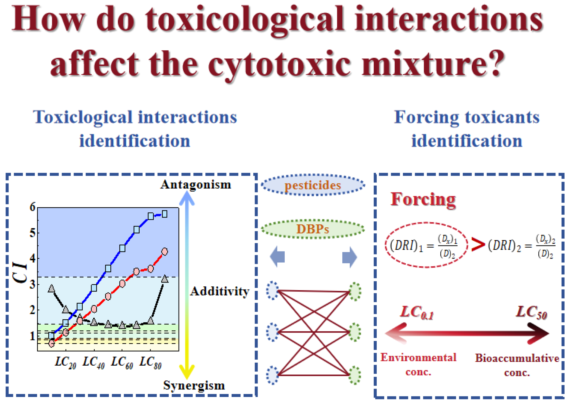 Pesticides and DBPs coexist in tap waters at trace levels, demanding attention for long term health protection. To allocate resource for water contaminant control, regulated chemicals need to be prioritized. The current prioritization is primarily based on the toxicity additivity assumption that ranks toxicity-weighted concentration of chemicals. However, recent findings revealed that the non-additive synergistic and antagonistic toxicological interactions are also prevalent in waters, potentially biasing previous prioritization rankings. To demonstrate a possible framework for improved prioritization, we identified the cytotoxic interactions, component contributions, and forcing compounds among six common toxic pesticides and DBPs based on the Chou-Talalay approach. In the “Malathion + DBPs” combination, the interaction type shifted from additivity to antagonism as the concentration increased, indicating concentration dependency. In the “Chlorothalonil + DBPs” combination, the strong antagonism led to a convergence of cytotoxicity value among the three mixtures. A comparison of cytotoxicity of “Deltamethrin + IAN/BAN” revealed that the interaction type affected the mixture-induced cytotoxicity. To unravel the cytotoxic interactions and forcing chemicals at both environmentally-relevant and bioaccumulation-attainable concentrations, we analyzed the componential contributions among “pesticides + DBPs” mixtures at LC0.1 and LC50 levels and identified the forcing cytotoxic compounds in each. At LC0.1, pesticides need to be prioritized in only two combinations out of nine; at LC50, DBPs should be prioritized only in “Chlorothalonil + DBPs” combinations. These results provide a framework for the prioritization among “pesticides + DBPs” in water and possibly other classes of contaminants.