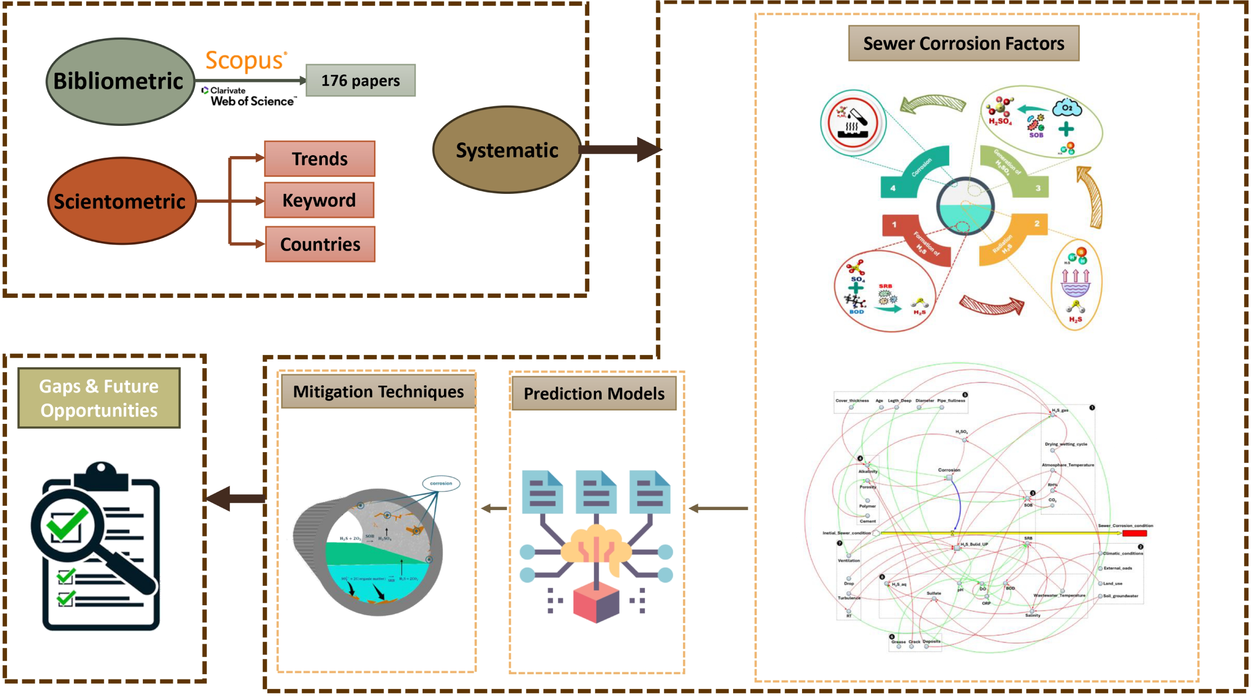 Sewer corrosion is a critical issue that significantly threatens sewer systems, contributing to approximately 40% of sewer infrastructure deterioration. Although numerous review studies have been conducted in this field, gaps persist in identifying the complex factors driving corrosion and understanding their interrelationships. These deficiencies impede the development of accurate corrosion prediction models and the identification of more effective mitigation strategies. This research aims to deepen the understanding of the underlying causes of sewer corrosion, evaluate the latest advancements in prediction models, and explore current mitigation techniques. A novel hybrid approach is employed, combining bibliometric, scientometric, and systematic analysis. While widely used in other fields, this methodology is new in sewer corrosion. The key findings of this study include a comprehensive identification of the various factors influencing corrosion, an overview of existing corrosion prediction models, and an evaluation of currently employed mitigation strategies. Additionally, this research highlights critical research gaps and suggests future avenues for investigation, with the potential to support municipalities in more efficient and flexible management of sewer infrastructure.