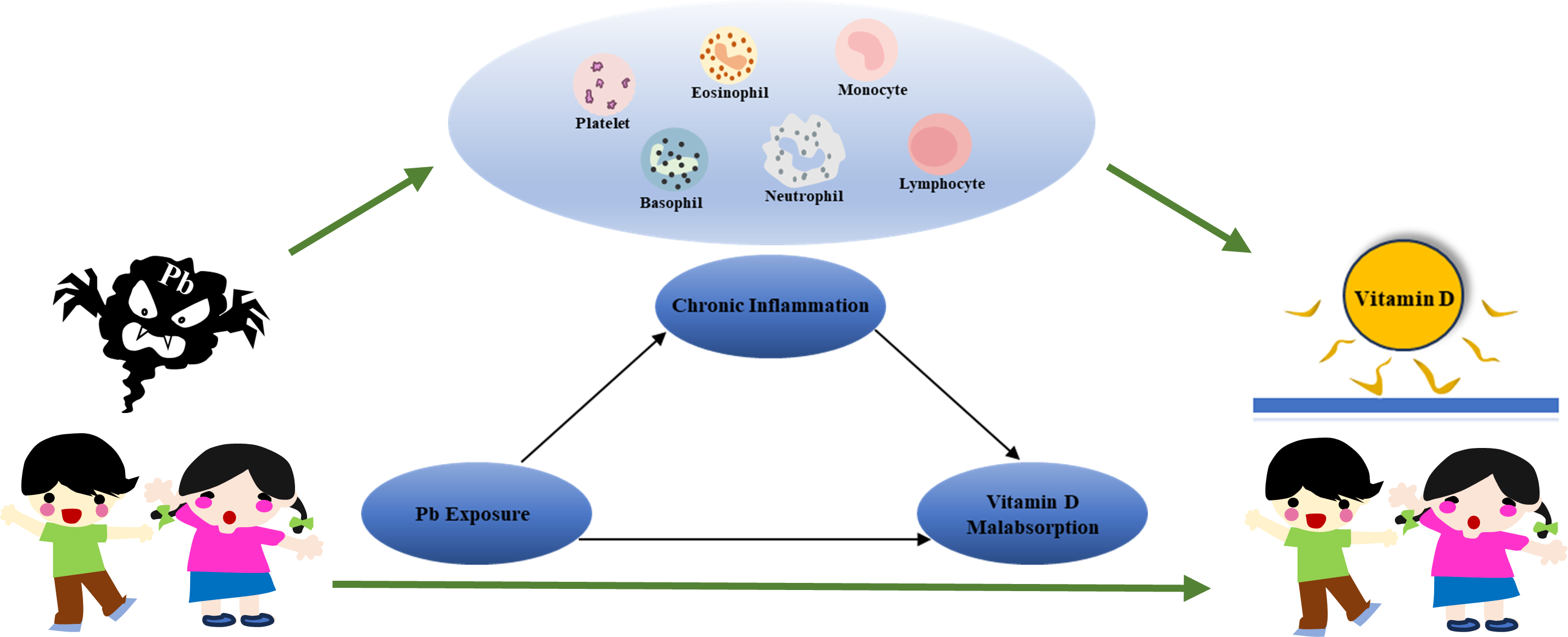 Lead (Pb) exposure and vitamin D deficiency have been independently linked to adverse health outcomes, but the relationship between Pb toxicity and vitamin D remains unclear. Therefore, this retrospective study evaluated this relationship in childr,en and explored the potential mediating role of immune inflammation. 653 children were enrolled in this study. The multivariable-adjusted linear regression model was employed to evaluate the does-effect associations among Pb exposure on inflammatory biomarkers and serum vitamin D levels. Concomitantly, mediating effect models were applied to identify the potential role of inflammation in the relationships between Pb exposure and vitamin D malabsorption. Our findings revealed lower vitamin D levels and elevated inflammatory markers in children with Pb exposure. We observed a dose-dependent relationship between serum Pb levels and vitamin D status, mediated by inflammatory responses. Specifically, SII demonstrated a complete mediating effect on the association between serum Pb and vitamin D3 levels (effect value: −0.280; 95% CI: −0.774, −0.021). These findings suggest that Pb-induced chronic inflammation may contribute to vitamin D malabsorption in children, which subsequently facilitates the occurrence of immune diseases. This therefore highlights the need for interventions to reduce Pb exposure and protect children from immunological diseases and detrimental health outcomes.