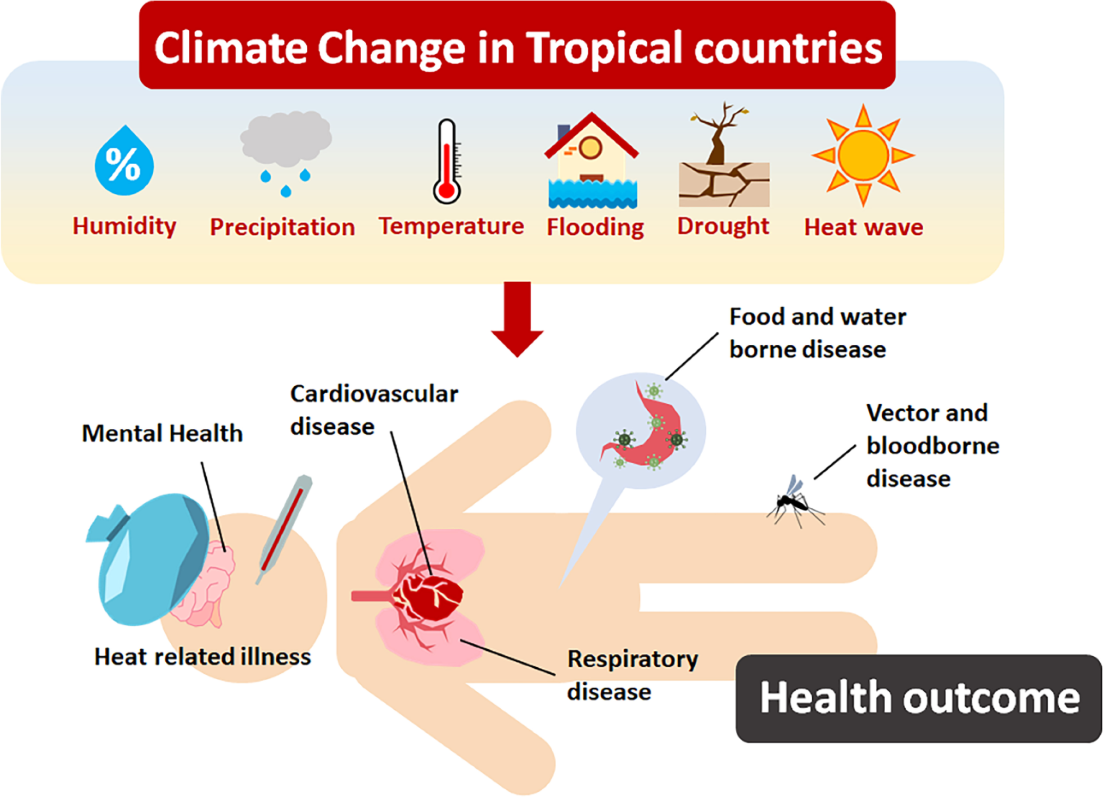 This narrative review evaluates the impacts of climate change, referring to the long-term shifting of temperature that could have wide-ranging impacts on societies across the globe. Moreover, changes in climatic factors could induce changes in environmental factors and/or the related health status in several ways, especially in tropical countries where both infectious and noninfectious diseases are prevalent. This review explores the relationships between diseases in tropical regions and climate change. An examination of the overall impacts of environmental factors in these countries highlights changes in health status and disease patterns related to food-borne and water-borne diseases, vector-borne diseases and remarkable noncommunicable diseases. Adaptation and mitigation measures, such as bolstering health systems and disease surveillance, are needed to address these findings. Resilience and public awareness are key components of effective policies, and cross-sector cooperation and sustainable financial practices are essential for improving health outcomes and combating diseases connected to climate change.