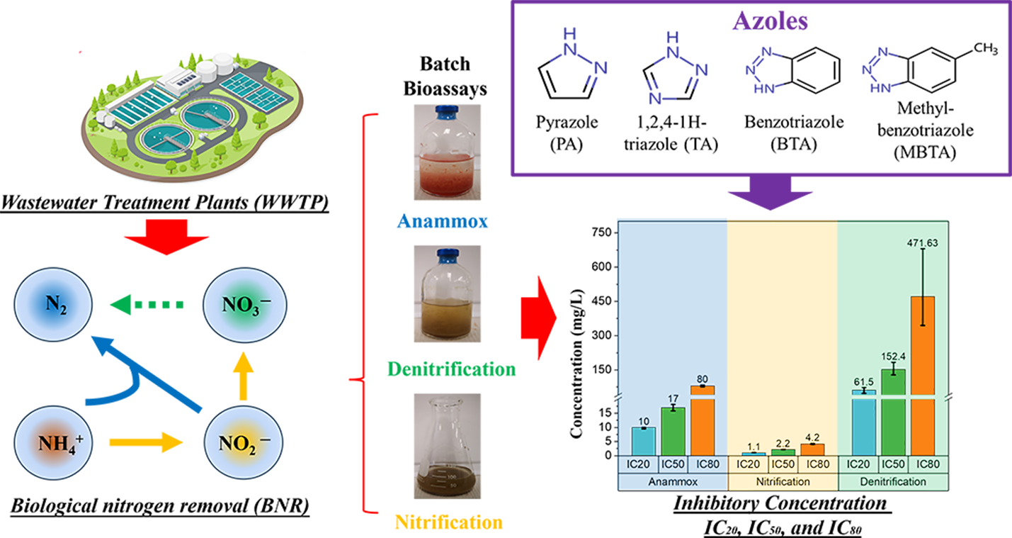 As emerging organic contaminants (EOCs), azoles have been detected in various environments. However, comprehensive information on the impact of azoles on biological nitrogen removal (BNR) processes in wastewater treatment is limited, particularly regarding the denitrification process. This study aims to investigate the short-term (< 24 h) inhibitory potentials of ten azole compounds on major BNR processes, including nitrification, denitrification, and anaerobic ammonium oxidation (Anammox). At 6 mg/L, pyrazole (PA), triazole (TA), benzotriazole (BTA), and methyl-benzotriazole (MBTA) caused over 90% inhibition of nitrification activity. In comparison, denitrifiers exhibited greater resistance to these azoles, with calculated half-maximal inhibitory concentrations (IC50) of 126, 520, 412, and 152 mg/L, respectively. Regarding Anammox, the calculated IC50 was 20 mg/L for BTA and 18 mg/L for MBTA, while PA and TA showed no significant inhibition (< 20%) at concentrations up to 250 mg/L. The granular structure of Anammox sludge did not exhibit additional protection from the inhibition. The ammonium oxidizing process in nitrification showed the highest sensitivity to tested azoles. The results are expected to aid in evaluating the stability of BNR processes for treating azole-containing wastewater and in developing effective strategies to protect BNR systems from disruptions caused by azoles.