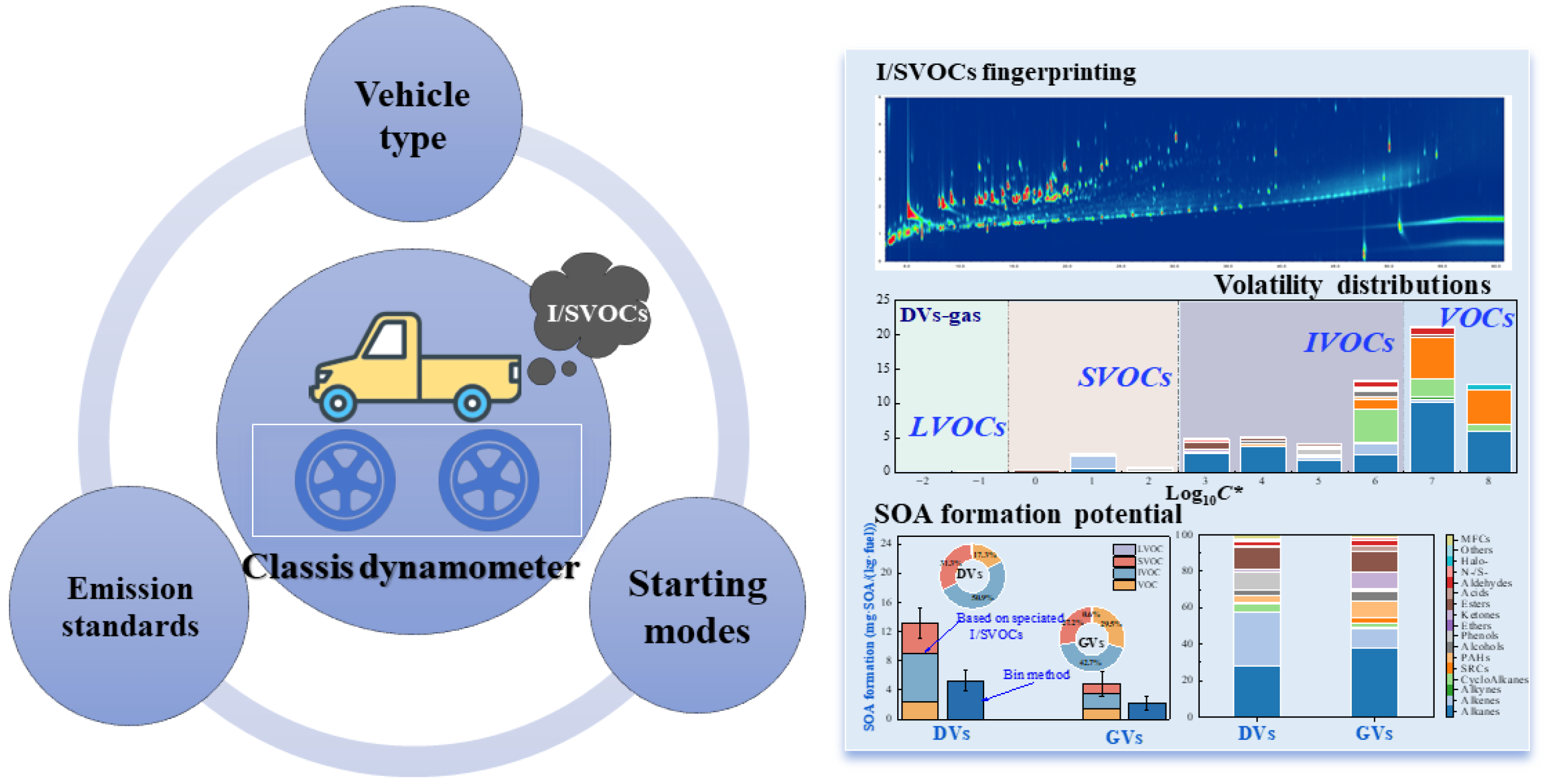 Intermediate and semi-volatility organic compounds (I/SVOCs) are crucial precursors for secondary organic aerosols (SOA). Vehicles are major sources of I/SVOCs, yet their emission profiles remain insufficiently characterized. We conducted dynamometer tests on eight in-use gasoline and diesel vehicles (DVs), employing non-targeted analysis with comprehensive two-dimensional gas chromatography coupled with high-resolution mass spectrometry (GC × GC-TOFMS) to investigate vehicular I/SVOC emissions at the molecular level. A total of 438 and 424 compounds were identified and (semi)-quantified in the gas and particle phases, respectively. DVs exhibited higher emission factors (376.7 ± 74.9 mg/(kg·fuel)) compared to gasoline vehicles (GVs) (114.4 ± 42.1 mg/(kg·fuel)) across both phases. Alkanes (29.7%–41.9%), single-ring aromatics (2.6%–29.8%), and cycloalkanes (1.0%–13.1%) were dominant I/SVOCs groups. Oxygenated I/SVOCs were more abundant in particulate phases (40.3%–56.8%) than in gas phases (14.4%–15.3%). Upgrading emission standards reduced organic emissions by 89.2% from China IV to China VI for DVs, particularly in the particle phase. Cold-start conditions resulted in higher I/SVOC emissions (528.4 mg/(kg·fuel)) than hot-starts (224.8 mg/(kg·fuel)) due to reduced combustion efficiency and suboptimal after-treatment performance at low temperatures. Our composition-based SOA estimation method improved SOA predictions by 1.5 and 1.2 times for diesel and GVs, respectively, compared to the traditional bin approach. These findings provide valuable insights into the molecular composition of vehicular I/SVOCs and their environmental impacts.