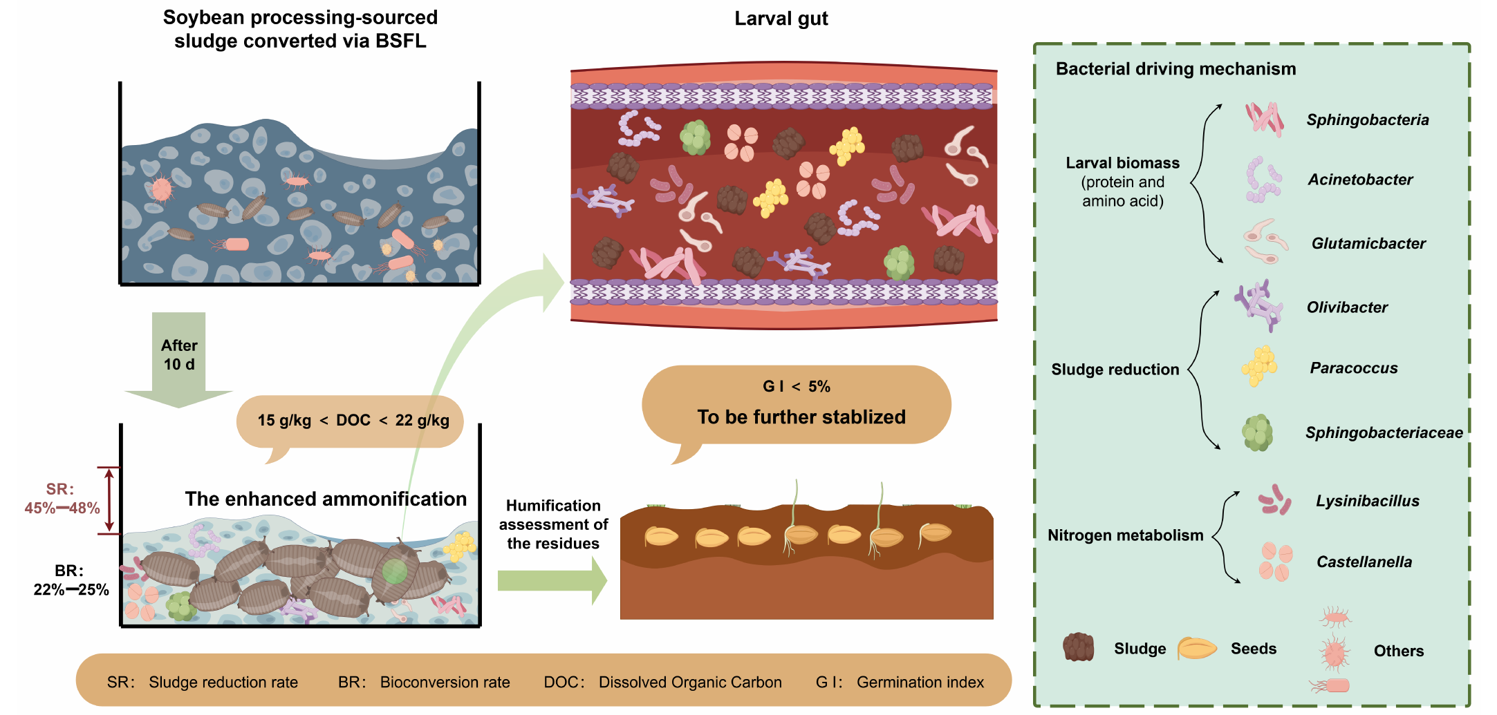 Download coverEfficient and environmentally sound treatment of soybean processing wastewater sludge is importance for industrial sustainability. Bioconversion by black soldier fly larvae (BSFL) has been extensively applied in biowaste recycling because of its efficacy and production of high-value outputs. However, the performance and underlying bacterial drivers of the BSFL-mediated sludge bioconversion require further investigation. This study investigated the larval bioconversion of the sludge, emphasizing waste reduction, larval quality, and the relationship between these aspects and bacterial communities. The inoculation with BSFL remarkably enhanced the reduction in the initial substrate (i.e., sludge plus wheat bran as the bulking material). This intervention also yielded a high larval bioconversion rate of approximately 22% along with a higher larval crude protein content ranging from 45%–48% and a 17 amino acid to protein ratio of 86%–92%. Higher dissolved organic carbon concentrations (15–22 g/kg), coupled with lower germination indices (< 5%), indicated that the residues retained biological instability after the bioconversion and required further composting. The potential risk of heavy metal pollution from mature larvae may not be a concern when used as aquaculture feed. The larval gut exhibited a higher bacterial diversity than the residues. Ammonium concentration increased with wheat bran and was positively correlated with the genera Lysinibacillus and Castellanella. Diverse gut bacteria (Olivibacter, Paracoccus) primarily facilitated notable sludge reduction. Sphingobacteria, Acinetobacter and Glutamicbacter played key roles in larval growth traits (biomass, protein, and amino acids). This study indicated that the valorization of soybean-processing-sourced sludge was achieved via functionally important BSFL intestinal microbiota, providing an efficient recycling approach for similar waste streams.
