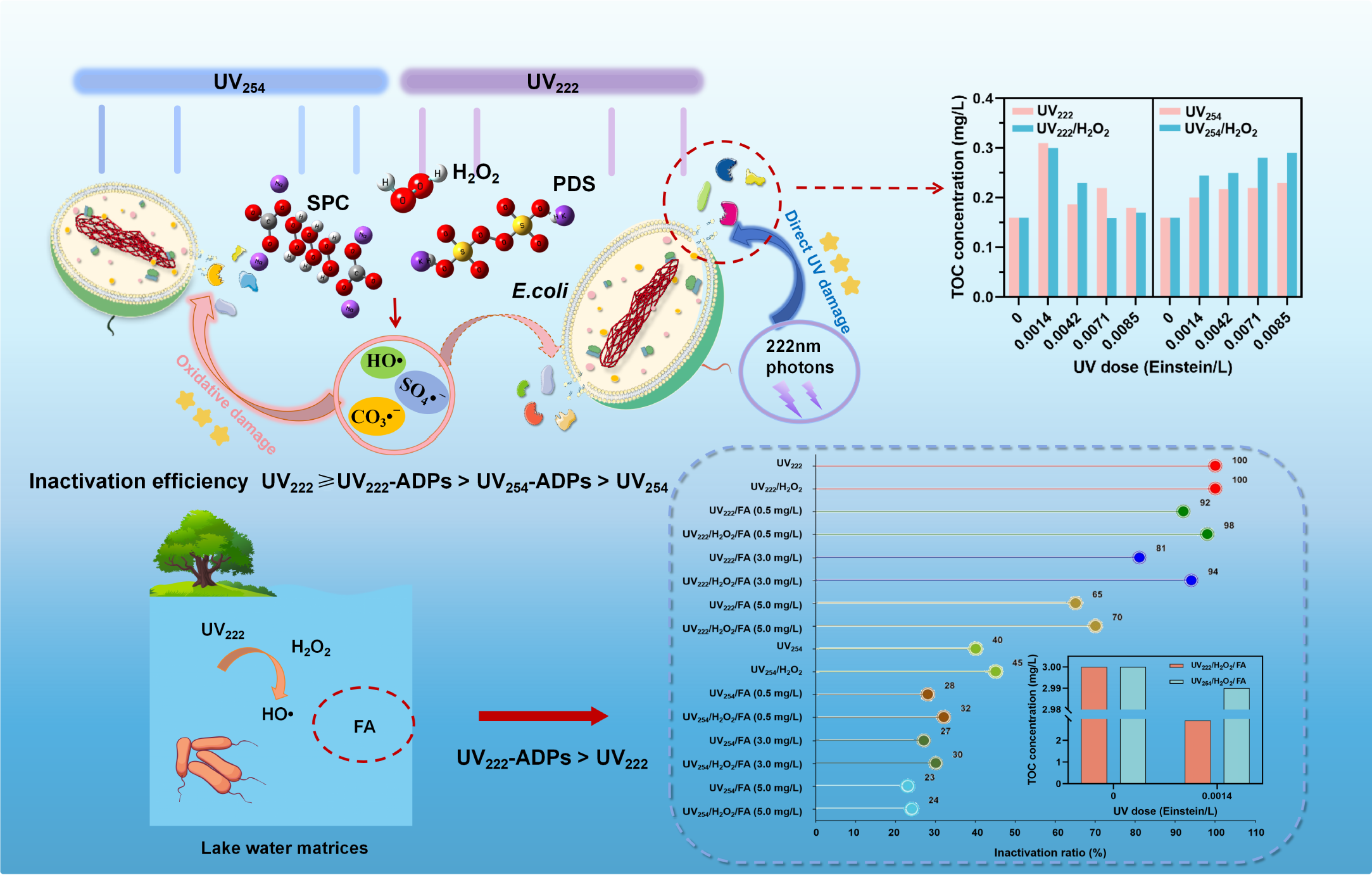 Pathogenic microorganisms pose a significant threat to water safety. Emerging disinfection processes that combine far-ultraviolet radiation with oxidants offer promising strategies for controlling these pathogens. This study investigated advanced disinfection processes (ADPs) that use 222 and 254 nm far-ultraviolet radiation in conjunction with hydrogen peroxide (H2O2), sodium percarbonate (SPC), and persulfate (PDS) to inactivate E. coli in water. The inactivation efficiencies of E. coli were measured as 6.50-log for UV222 alone and 2.50-log for UV254 alone at 0.0014 Einstein/L. When using UV222-ADPs, the inactivation ranged from 5.20-log to 6.50-log, while UV254-ADPs achieved inactivation levels of 2.55-log to 2.95-log. The inactivation occurred in the order of UV222 ≥ UV222-ADPs > UV254-ADPs > UV254, which was related to photon competition between E. coli and the oxidants, superiority of UV222 radiation compared with UV254 radiation, and the yields of radicals. When UV222 was combined with H2O2, SPC and PDS, the absorption fractions of 222 nm photons by E. coli reduced from 13.7% to 13.1%, 12.4%, and 12.2%, respectively, and the actual inactivation also decreased. This reduction was attributed to the light shielding effect of the oxidants. In addition, intracellular organic matter released from ruptured bacterial cell membranes during UV222-ADPs could be further damaged by UV222 photons and radicals. The effectiveness of UV222-ADPs was also demonstrated in real water samples. Moreover, it was shown that UV222-ADPs are less susceptible to dissolved organic matter (DOM) than UV222 alone. This study provides novel insights into disinfection by UV222-ADPs in water.