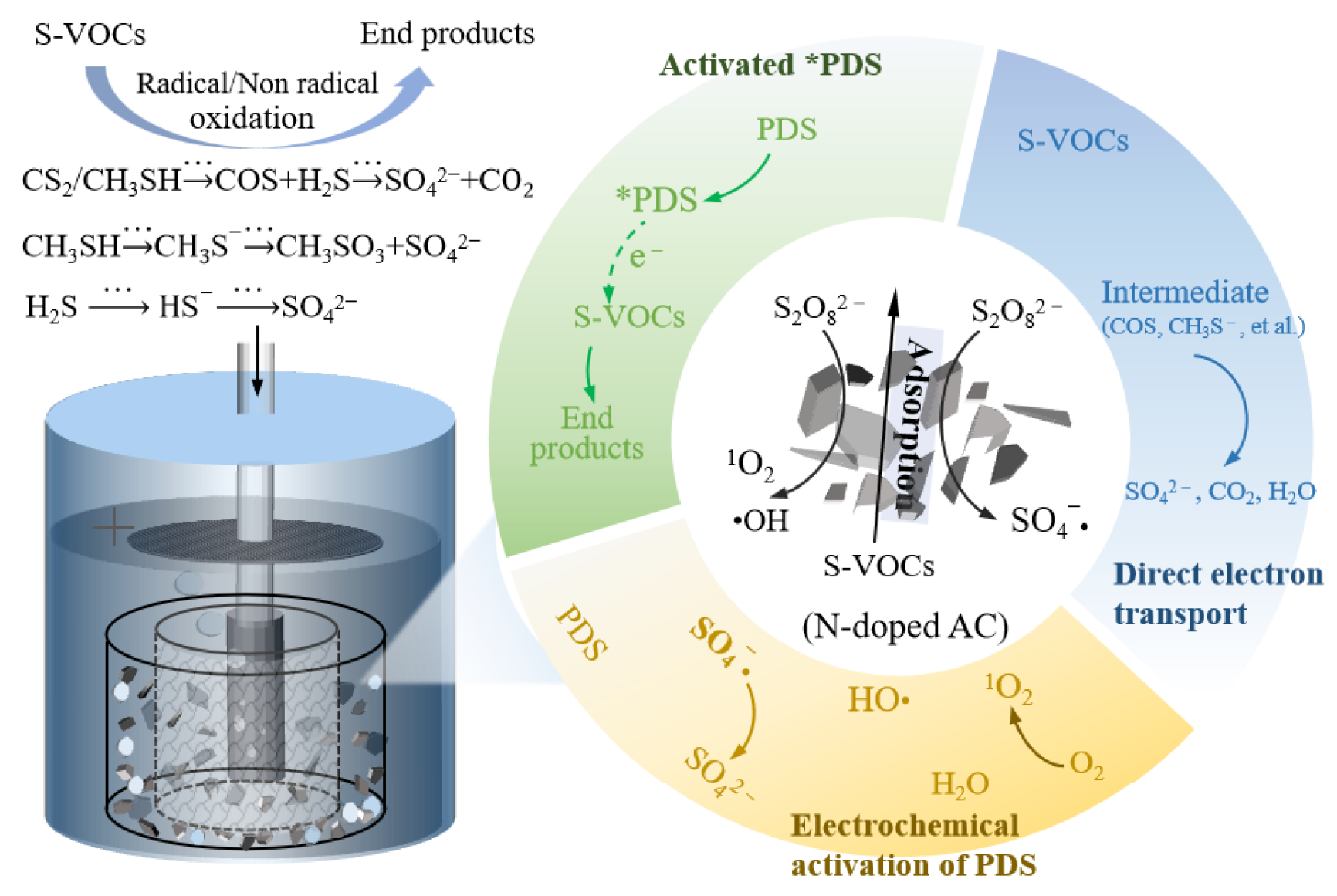 N-doped activated carbon (AC) was employed in a three-dimensional electrode system (3DES) to enhance the removal of sulfur-containing volatile organic compounds (S-VOC). The technical parameters for preparing N-doped AC were optimized based on CS2 removal and COS accumulation, where the mass ratio of AC to urea was 1:1.0, and the activation temperature and heat-treatment time were 400 °C and 120 min, respectively. When the mixing S-VOC were purified under an operating voltage of 8 V and peroxydisulfate concentration of 0.15 mol/L, CS2 removal in the 3DES system with N-doped AC reached 100% within 75 min, and was above 83% as purification time extended to 200 min. Additionally, the COS content in the outlet gas was usually undetectable within 120 min, and was lower than that in the other electrochemical systems. Modification of raw AC through urea impregnation and subsequent heat treatment significantly improved its surface structure and pore size distribution. Moreover, polar functional groups, such as C=O and pyridinic-N, increased noticeably, enhancing the S-VOC adsorption capacity and dielectric properties. Consequently, highly reactive substances were more efficiently activated in 3DES system with N-doped AC, and oxidizing species HO• and 1O2 had important contributions to S-VOC purification compared to SO4–• radicals. A pathway was proposed to elucidate the transformation of sulfur-containing components, such as CH3SH and CS2. This study provides an efficient approach for S-VOC purification.