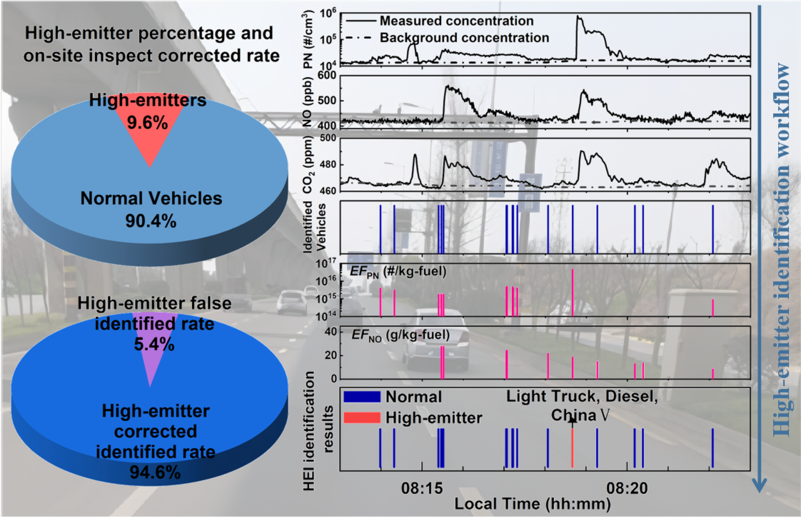 A small fraction of high-emitting vehicles make disproportionally large contributions to total fleet emissions. Therefore identifying high emitters under real driving conditions is crucial. In this study, two portable sensor platforms for high-emitter identification were used for online roadside measurements of vehicle-emitted NO, particle number (PN), and CO2 concentrations in Tangshan and Chengdu, respectively. The measured mean concentrations of vehicle-emitted NO, PN, and CO2 in Tangshan and Chengdu were 27.7–32.9 ppb, 5.4 × 103–8.2 × 103 #/cm3, and 7.3–8.2 ppm, respectively. Based on more than one month of second-by-second measured pollutant concentrations and passed vehicle information, a scheme was developed to identify high emitters. Among the 217000 and 43000 vehicles that passed the roadside sensor platforms at Tangshan and Chengdu, approximately 60% and 73% of vehicle exhaust plumes were successfully detected using the sensor platform. The NO and PN emission factors (EFs) tended to have log-normal distributions with the median values of 14.3 g/kg-fuel and 1.3 × 1015 #/kg-fuel, respectively. In general, the percentages of high-emitters identified at the Tangshan and Chengdu sites were 8.7% and 12.2% of the total identified vehicles, respectively. Among these high-emitters, 122 vehicles were randomly inspected on-site with the assistance of traffic officers, and the rate of correct identification was approximately 95%, which demonstrates that our methodology performs well in identifying real-world high-emitters. Overall, its low cost, good mobility, strong adaptability, and high correct identification rate make this roadside sensor platform a promising approach for real-world high-emitter identification.