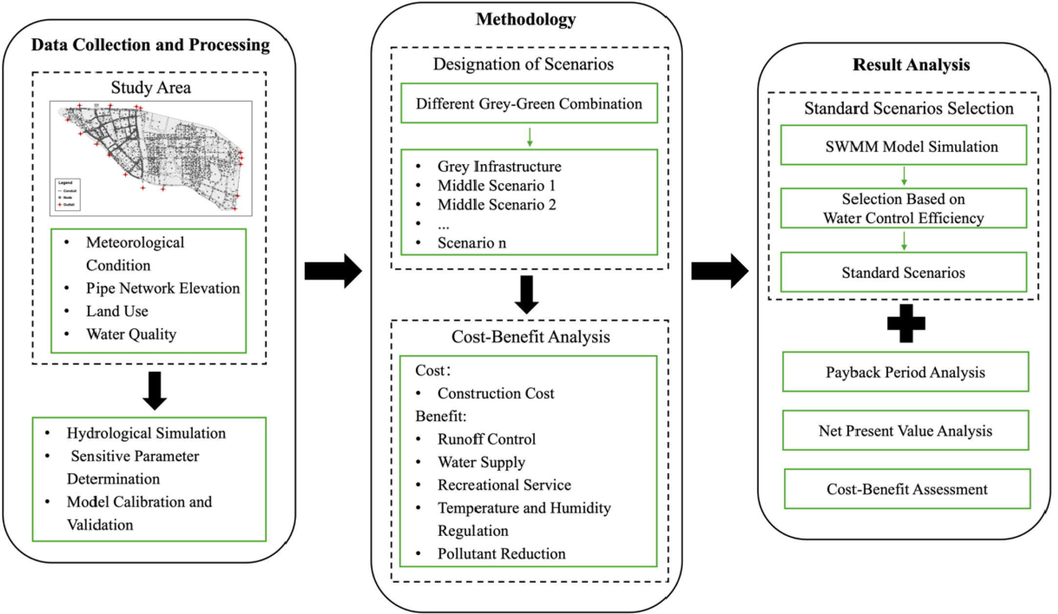 This study promotes the integration of ecological green infrastructure with traditional gray infrastructure to tackle urban water management challenges and safety issues. Using the Storm Water Management Model (SWMM), we simulated runoff control in Beijing Tongzhou District Sponge City Pilot Area across 15 gray-green infrastructure scenarios and identified the optimal strategy through a cost-benefit analysis focusing on scenarios that meet runoff control standards. A cost-benefit evaluation framework was developed for gray-green infrastructure projects, employing payback period and net present value methods to assess cost-effectiveness. Findings revealed notable operational benefits, particularly in temperature and humidity regulation, which accounted for 88% of the total benefits. A standout scenario with a rapid payback period of 7.16 years and a net benefit of 1957.7 million yuan was highlighted. The research provides a holistic assessment, integrating environmental, ecological, and economic aspects of gray-green infrastructure, offering insights for effective green infrastructure deployment and evaluation in sponge city construction.