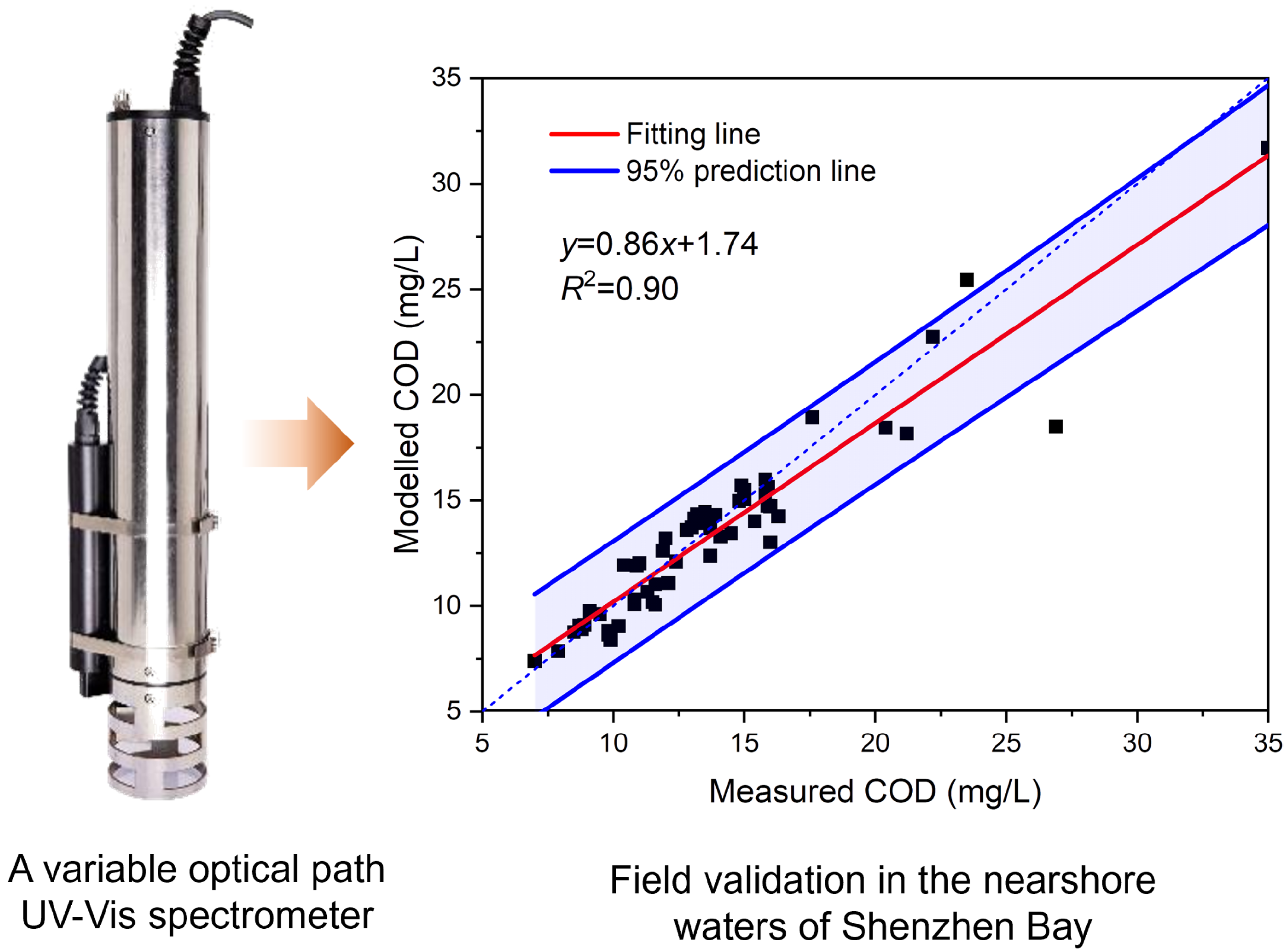 The variation in pollutant concentrations among different water bodies poses a significant challenge for environmental surveillance. Traditional UV-Vis spectrometers, with fixed optical paths, face limitations in accurately determining Chemical Oxygen Demand (COD) and other water quality parameters. High concentrations surpass the detection limit, while low concentrations yield weak response signals, thereby compromising measurement accuracy. This study tackles these challenges by enhancing a UV-Vis spectrometer with a variable optical path. By utilizing a right-angle reflector for reflection and a stepping motor for control, measurements are conducted within the wavelength range of 190–700 nm. The instrument incorporates a spectral fusion algorithm to optimize spectral measurements within its operational range. Furthermore, a Partial Least Squares (PLS) model has been established for COD inversion by using laboratory standard solutions and field samples. The spectrometer has been tested in the nearshore waters of Shenzhen Bay, China, validating its applicability and the model’s accuracy. The utilization of a variable optical path UV-Vis spectrometer facilitates the acquisition of precise monitoring data with wide measuring range, thereby enabling the prompt detection of anomalies and subsequent reduction in reaction time.